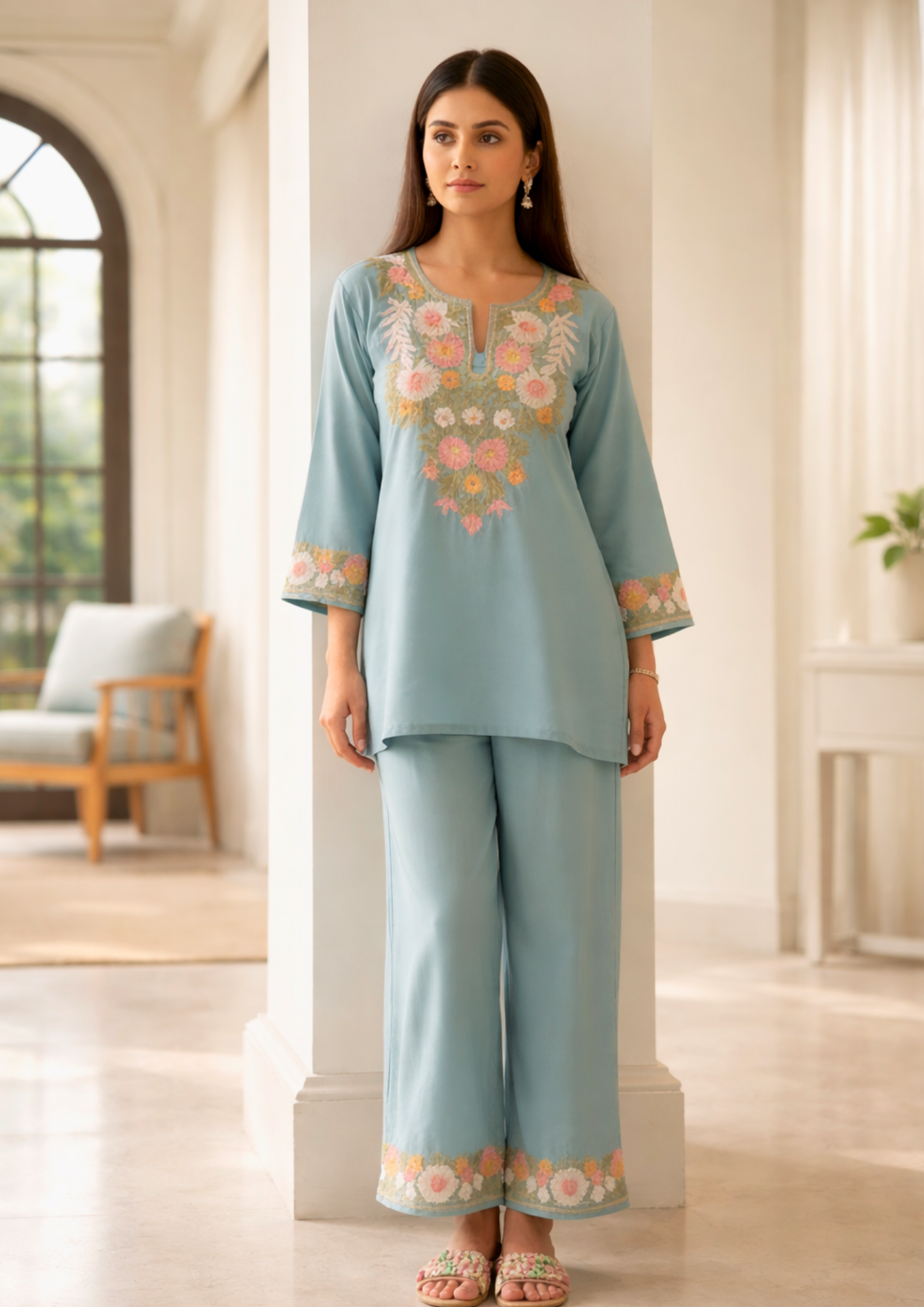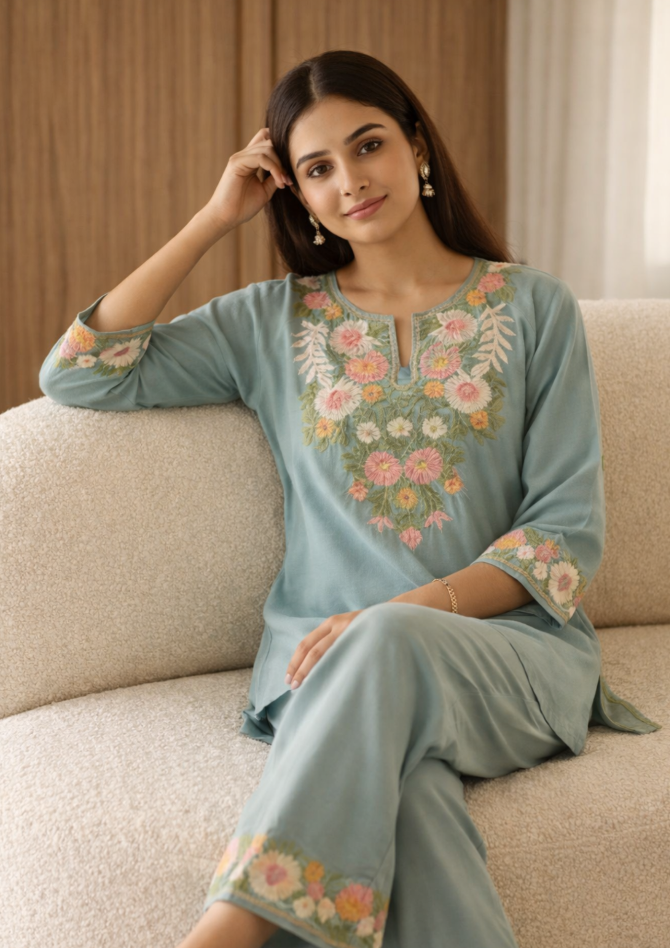 Sea Green Embroidered Cotton Kurta With Straight Pant