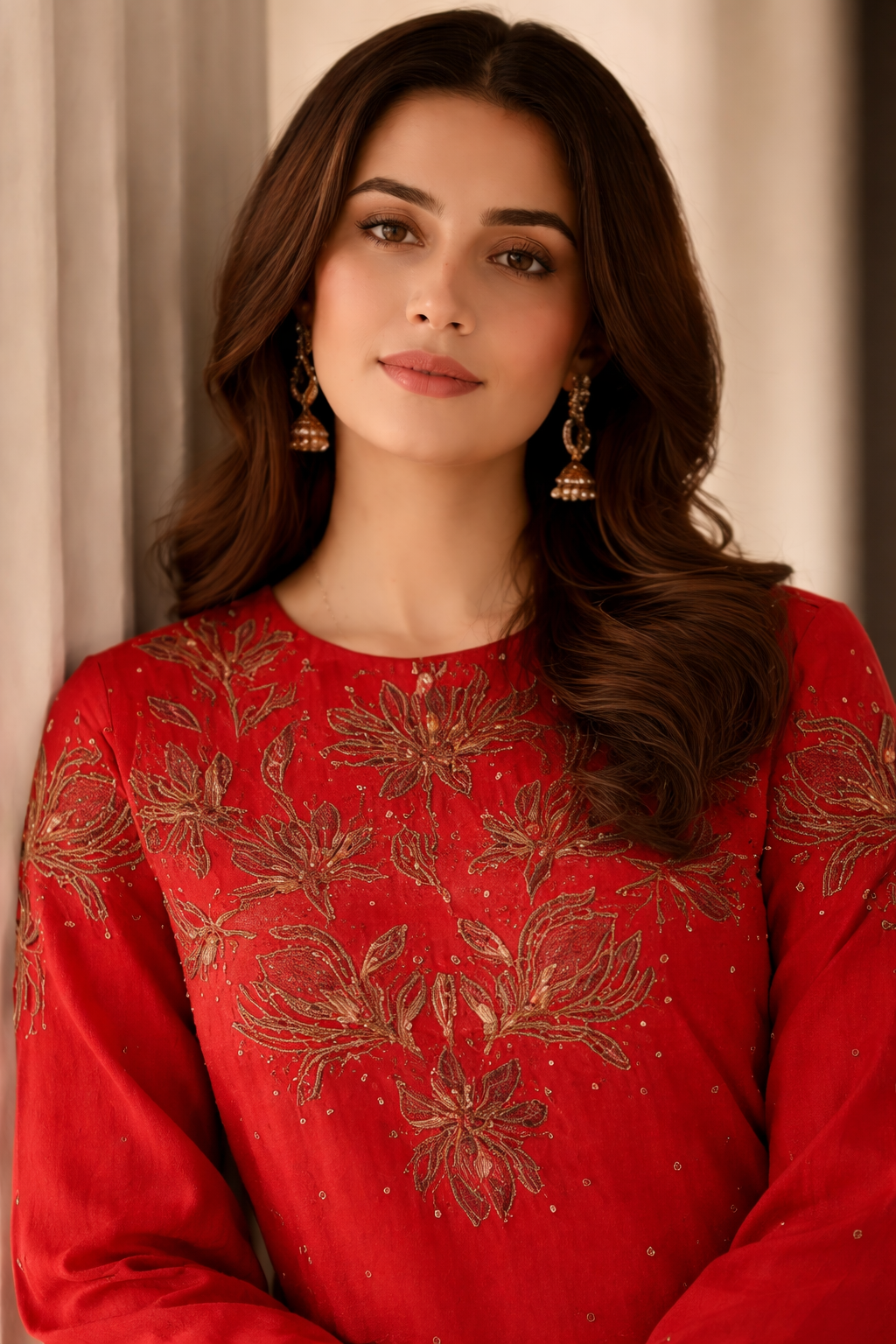 Red Cotton Blend Embroidered Short Kurta With Straight Pant