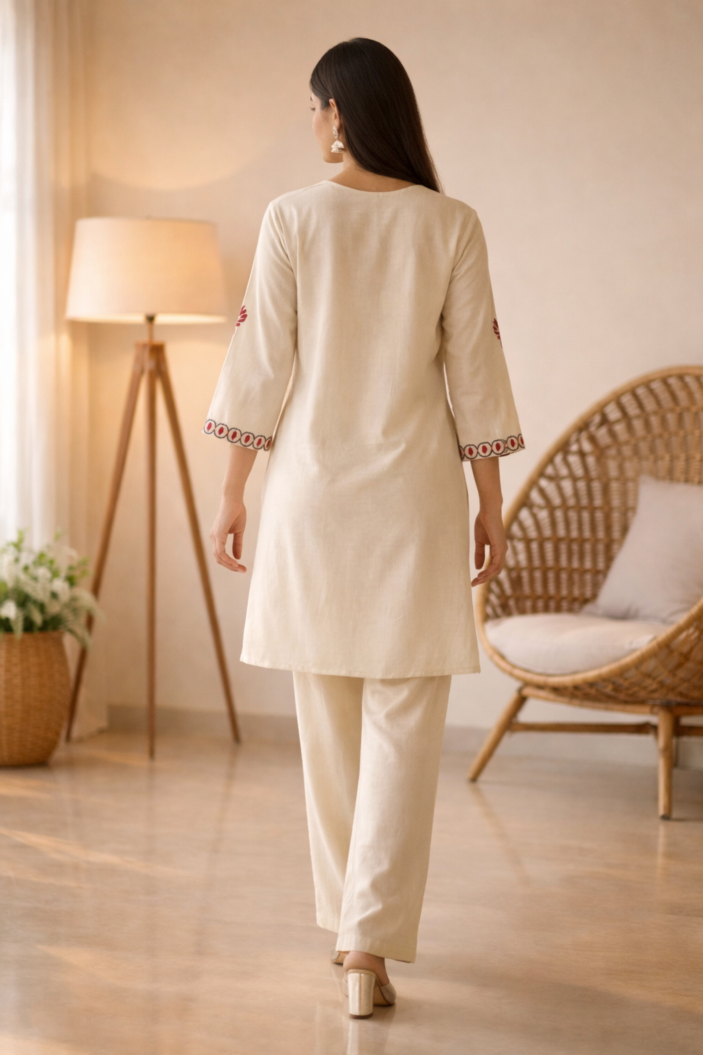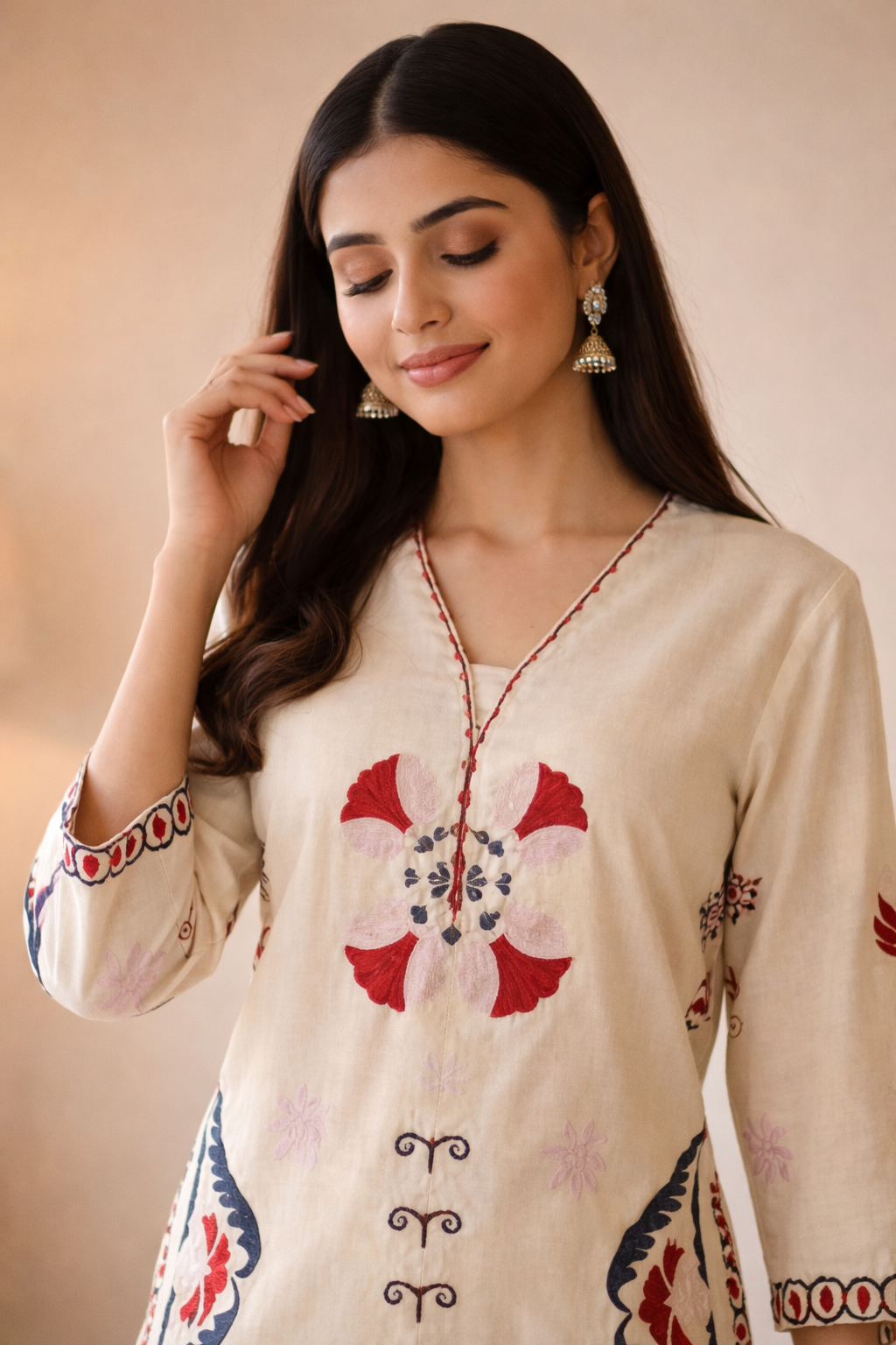 Cream Cotton Short Kurta Pant With Vibrant Floral Ethnic Motifs
