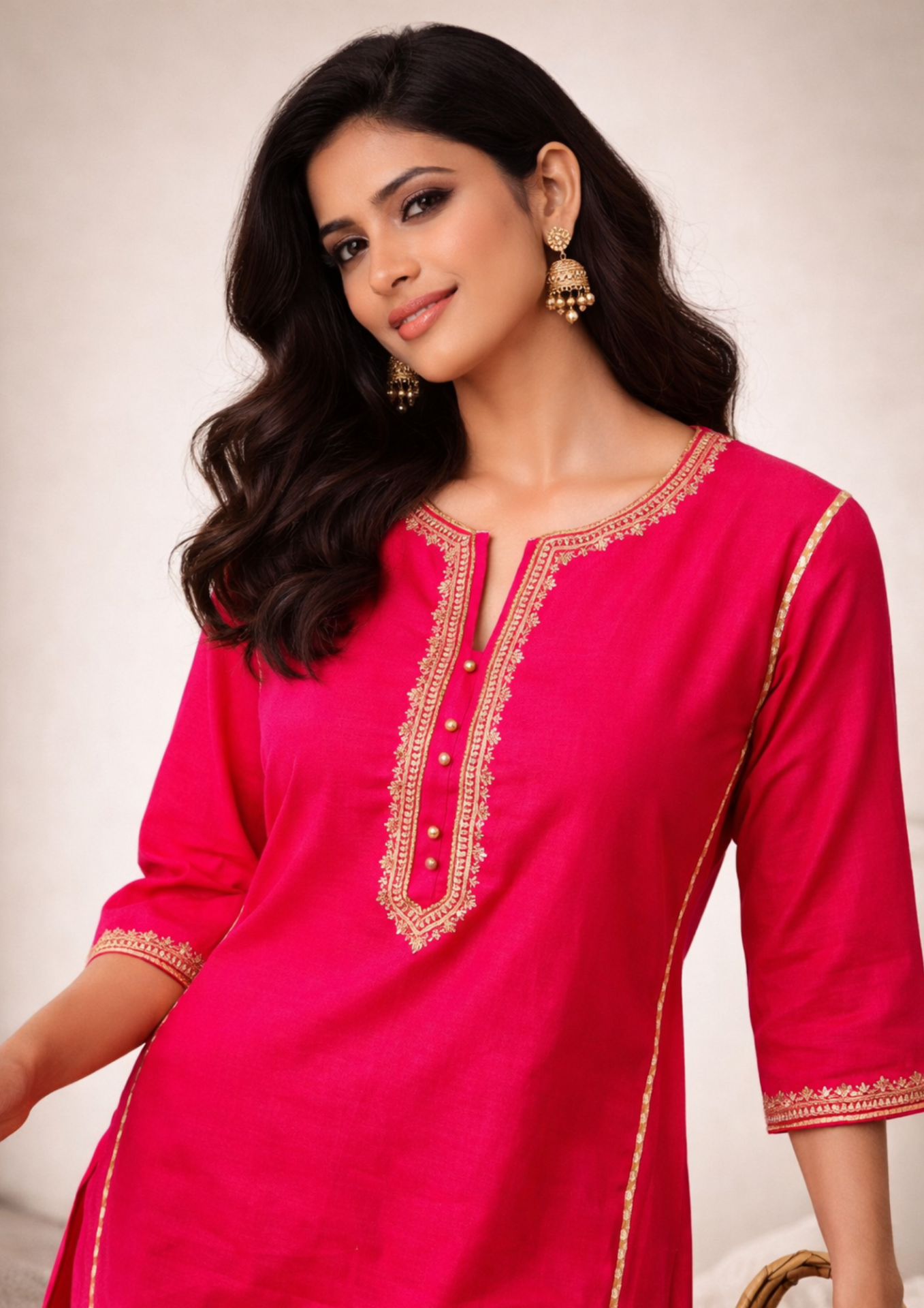 Rani Pink embroidered round neck silk kurta pant set