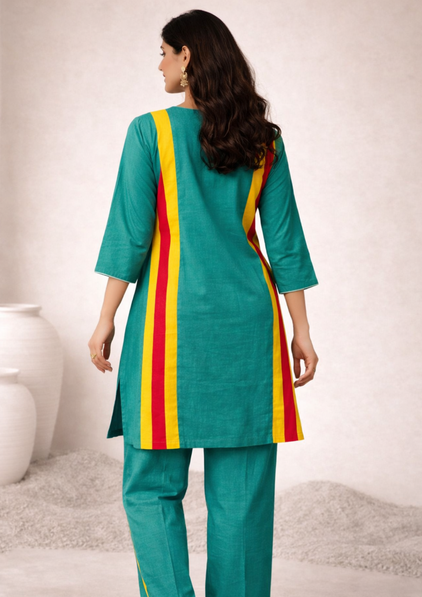 Teal Green with Yellow Pink Striped Panels linen Kurta Pant Set