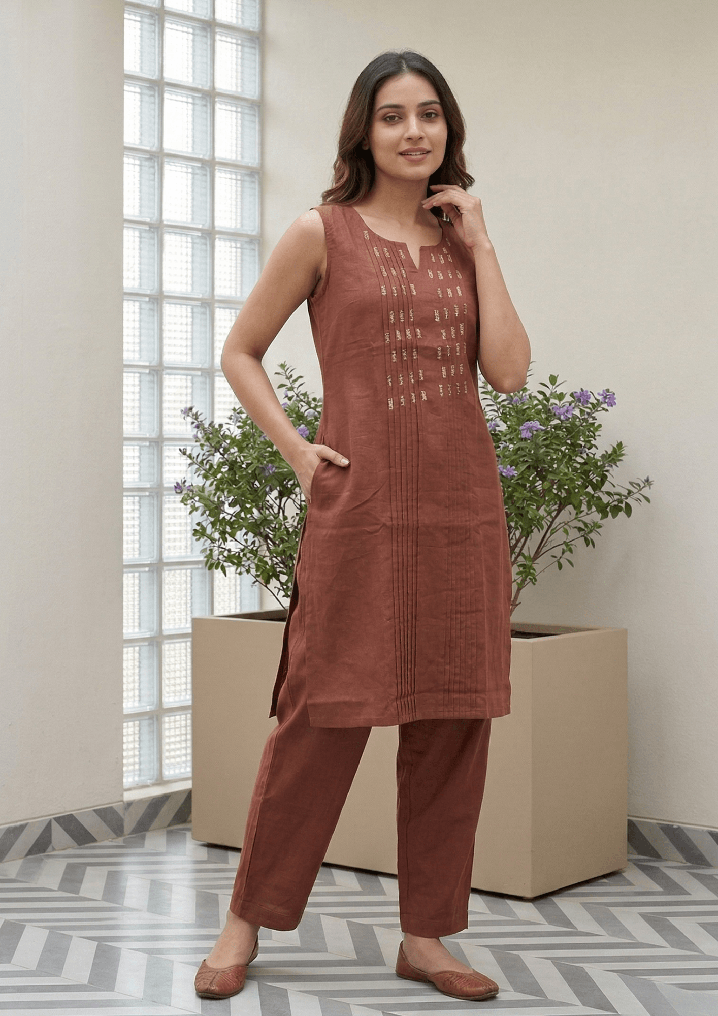 Rust orange cotton kurta pant set with subtle thread embroidery