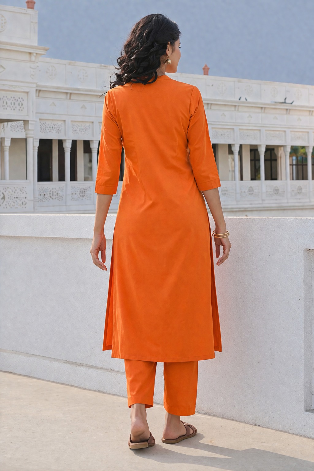 Orange linen colour block Kurta pant set