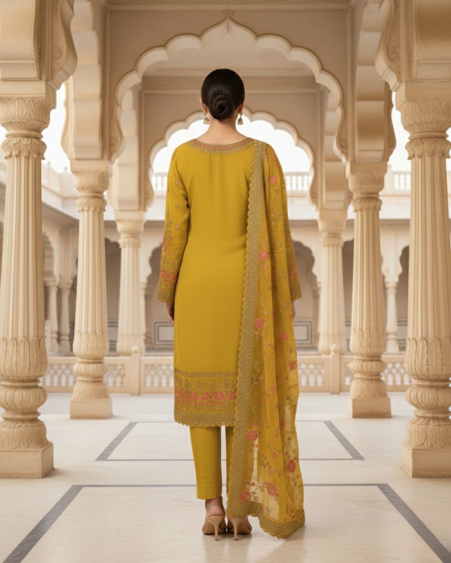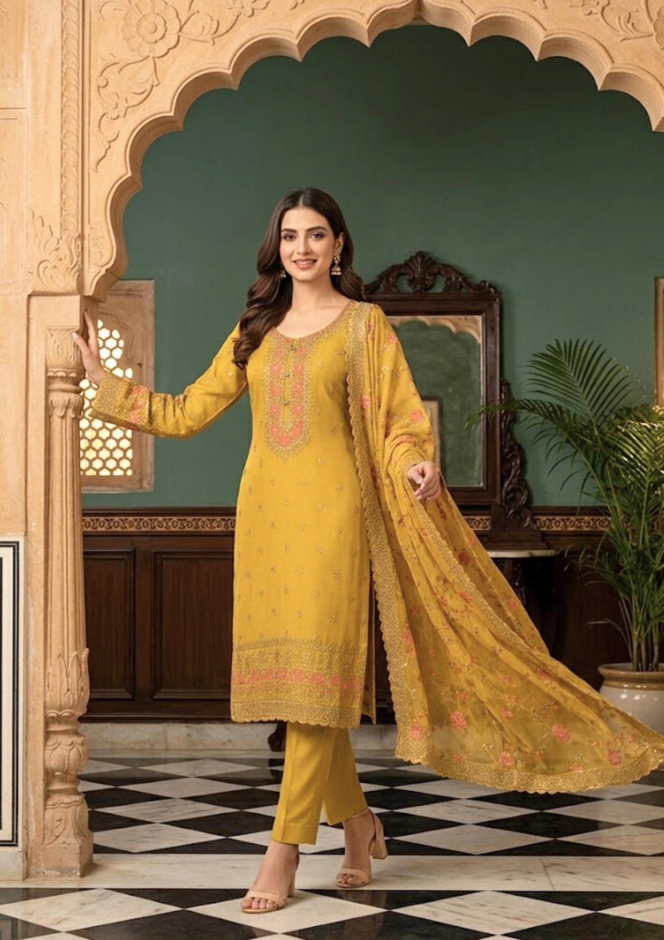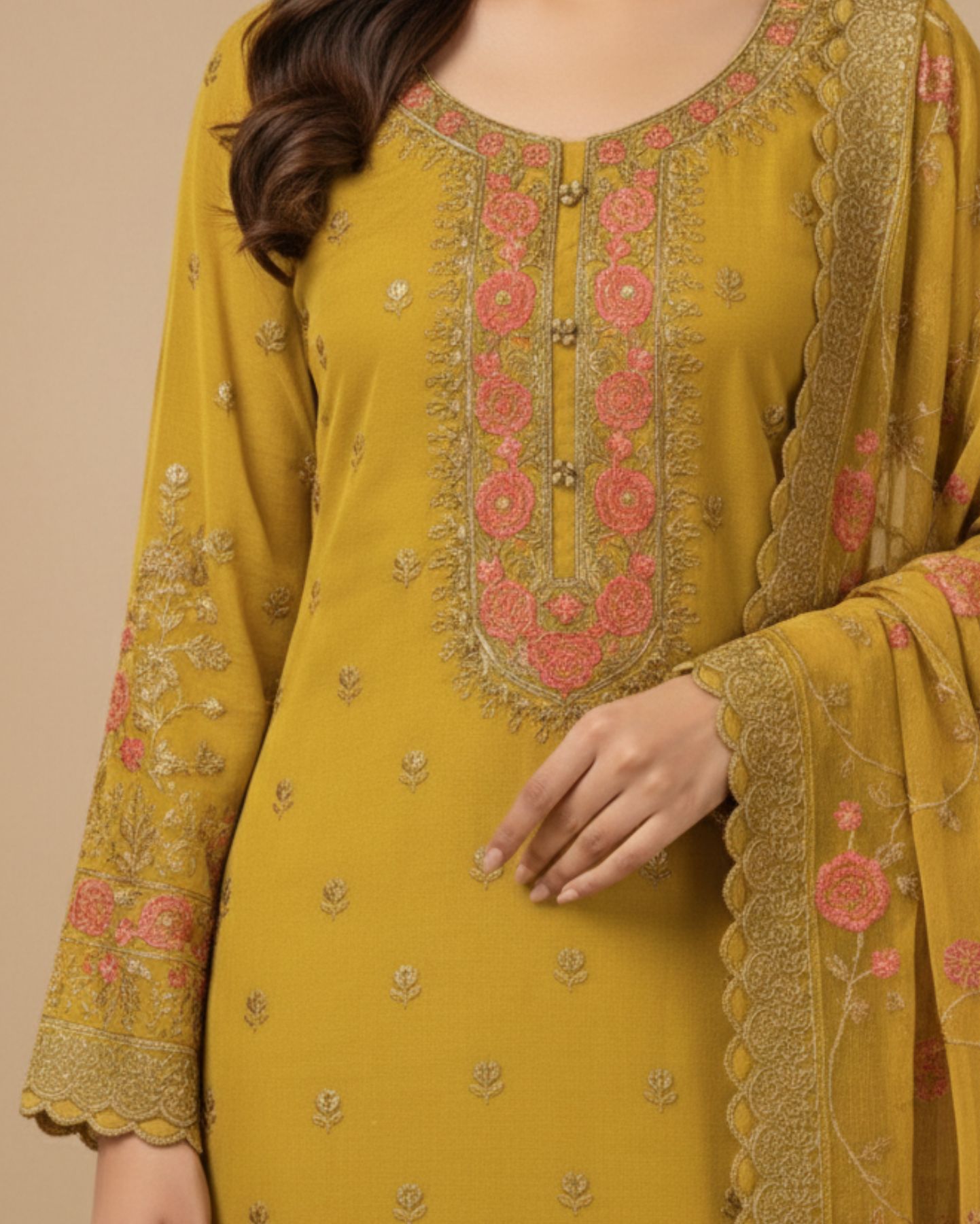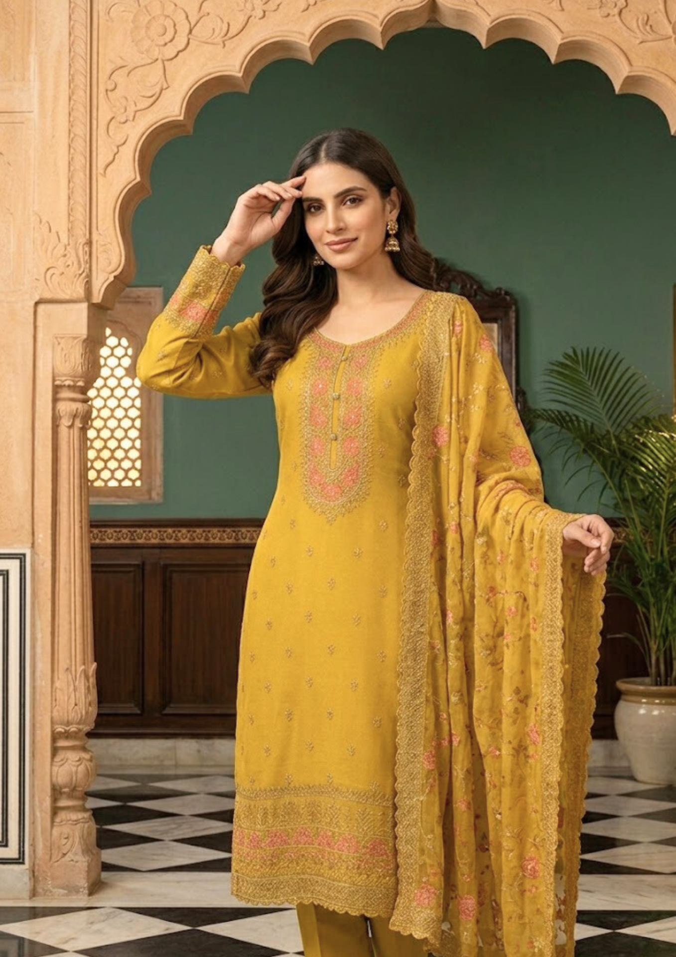 Semi-stitched Soft Chiffon-Muslin In Mustard-Gold With Delicate Sequin Floral Embroidery Suit Material