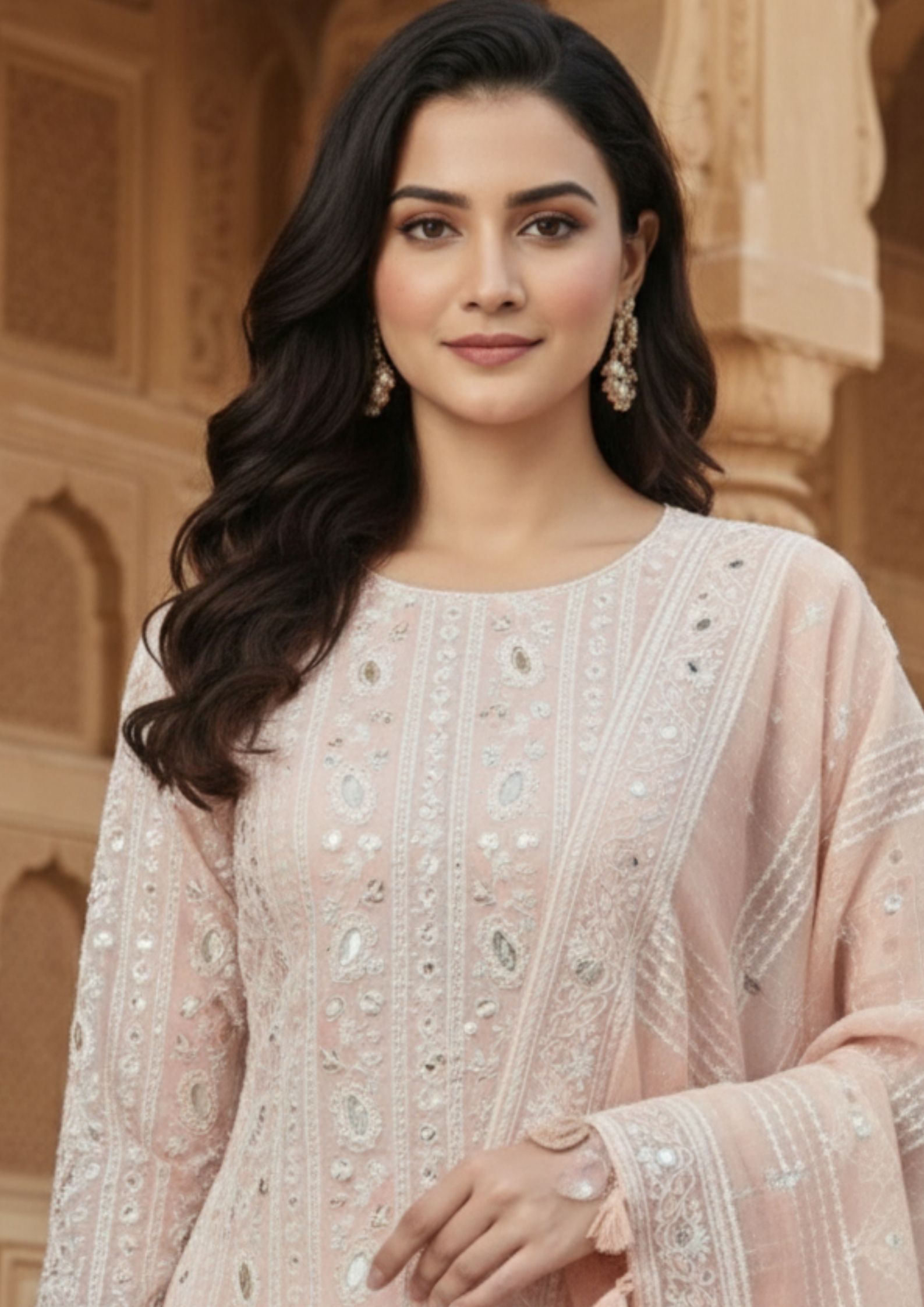 Unstitched Soft Peach Georgette Suit With Ivory Resham Embroidery And Subtle Sequin Highlights
