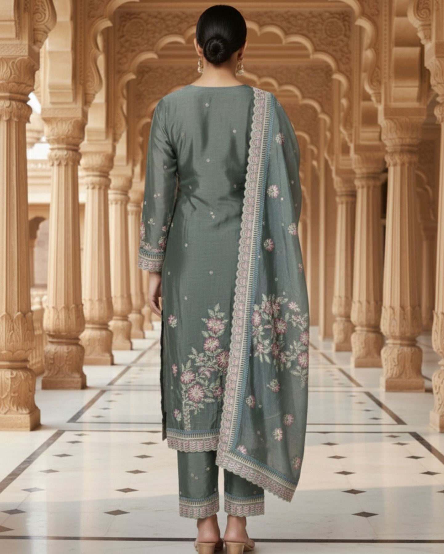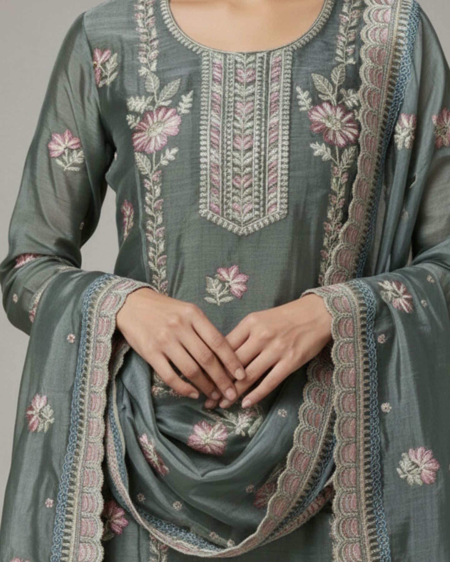Semi-Stitched Shimmer Net Fabric In Deep Olive With Multicoloured Thread Embroidery Suit Material