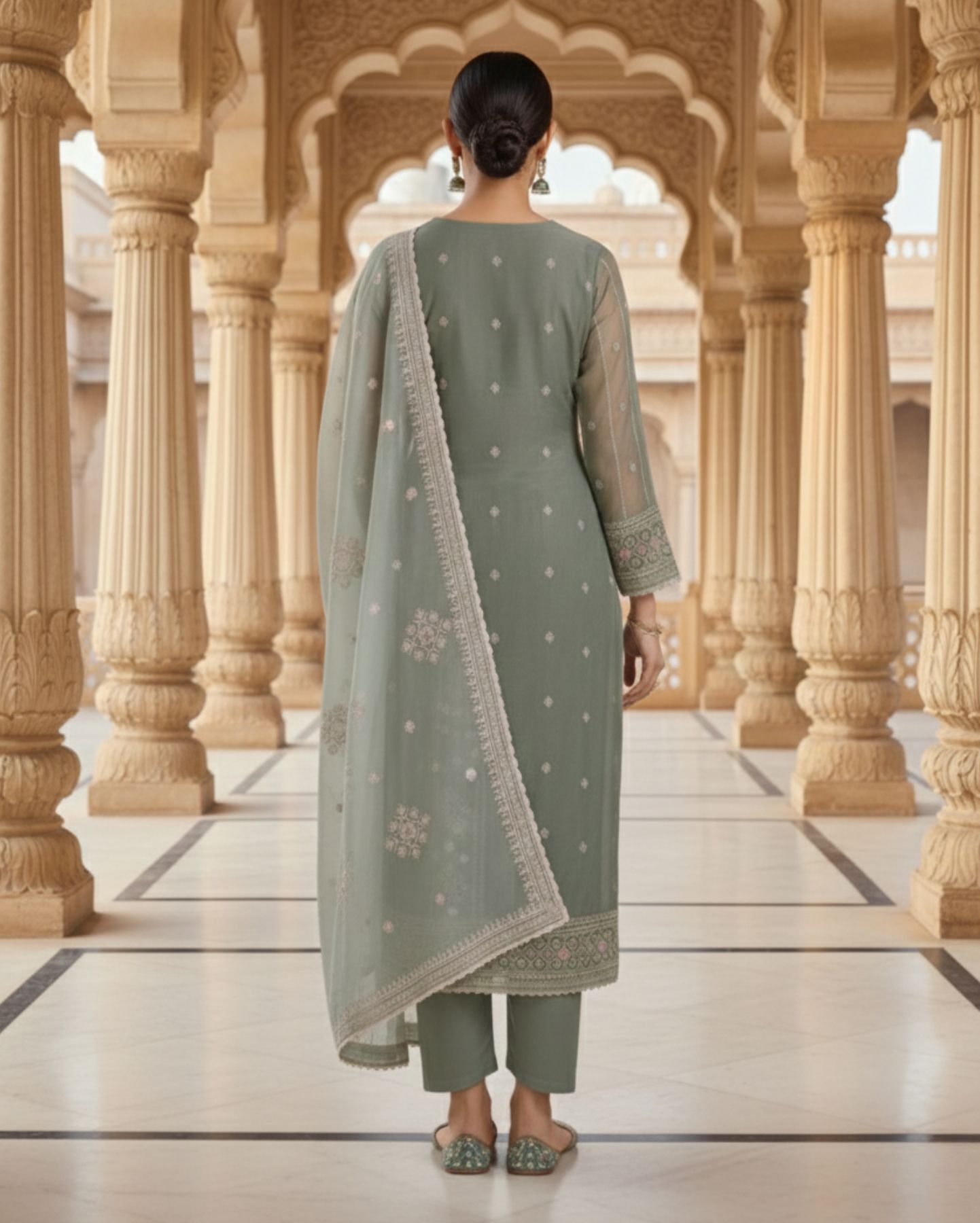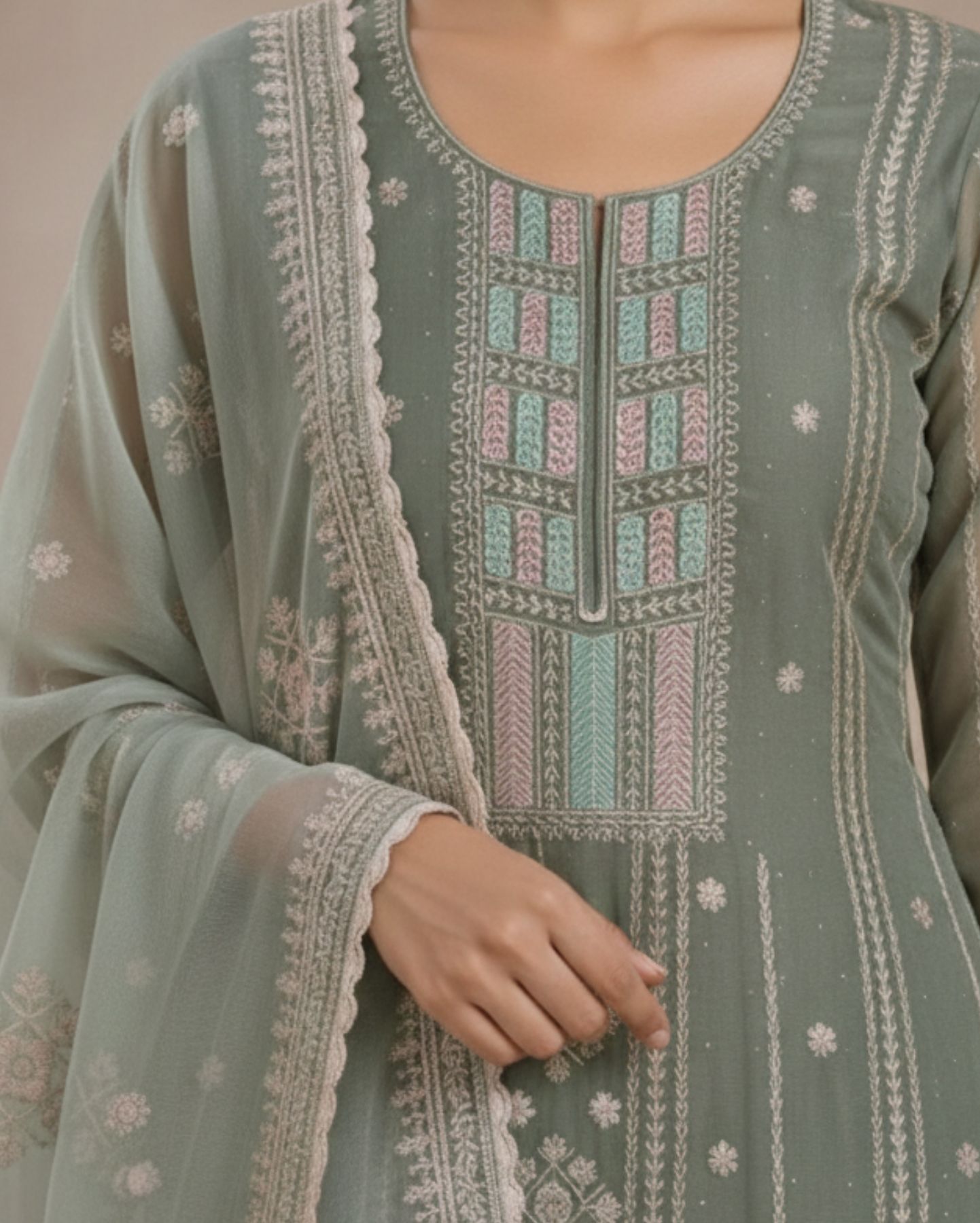 Semi-Stitched Sage Green Sheer Organza With Pastel Zari Embroidered Suit Material