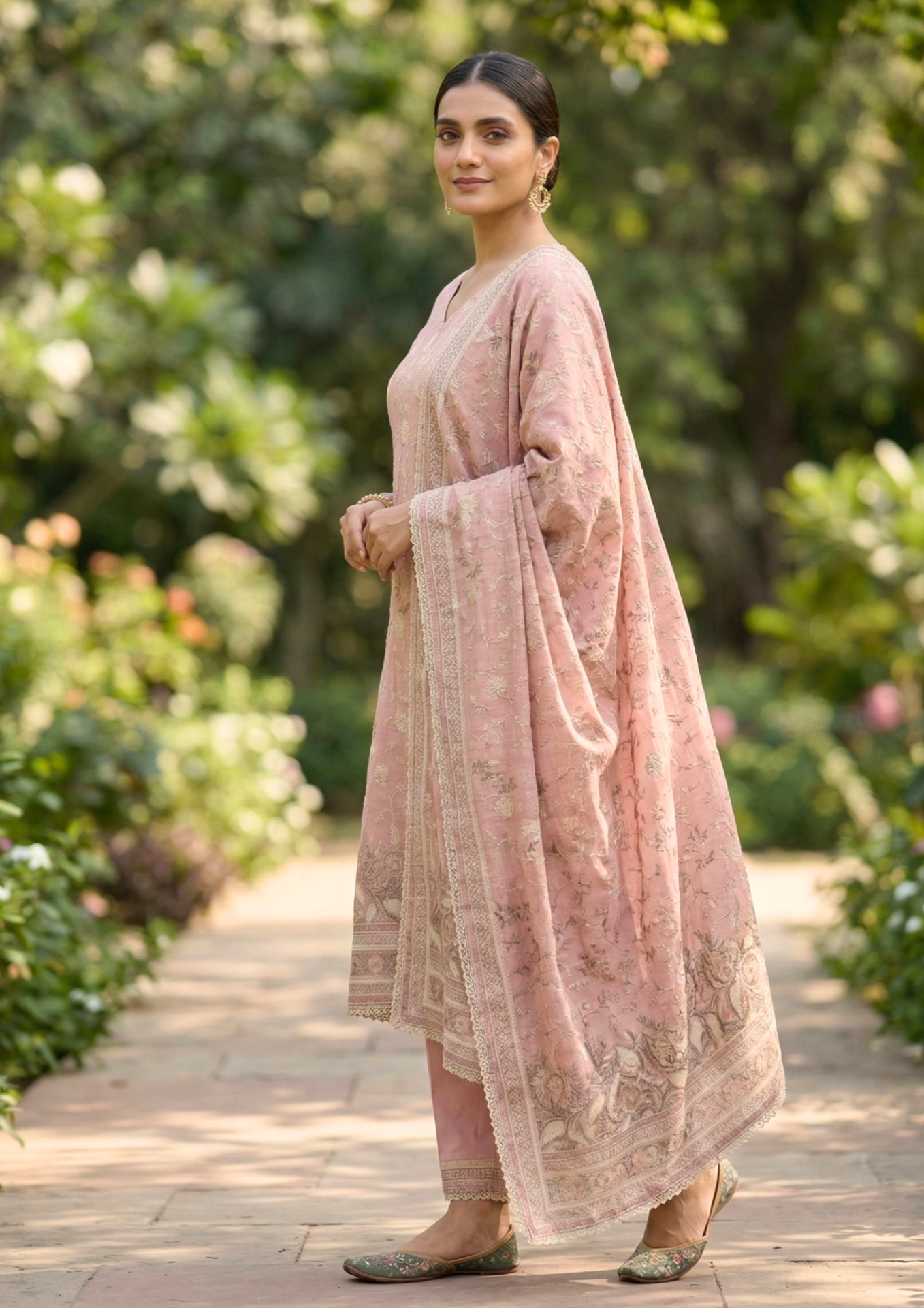 Unstitched Antique Rose Pink Fine Muslin-Cotton Blend With Sequin Accents And Textured Embroidered Suit Material