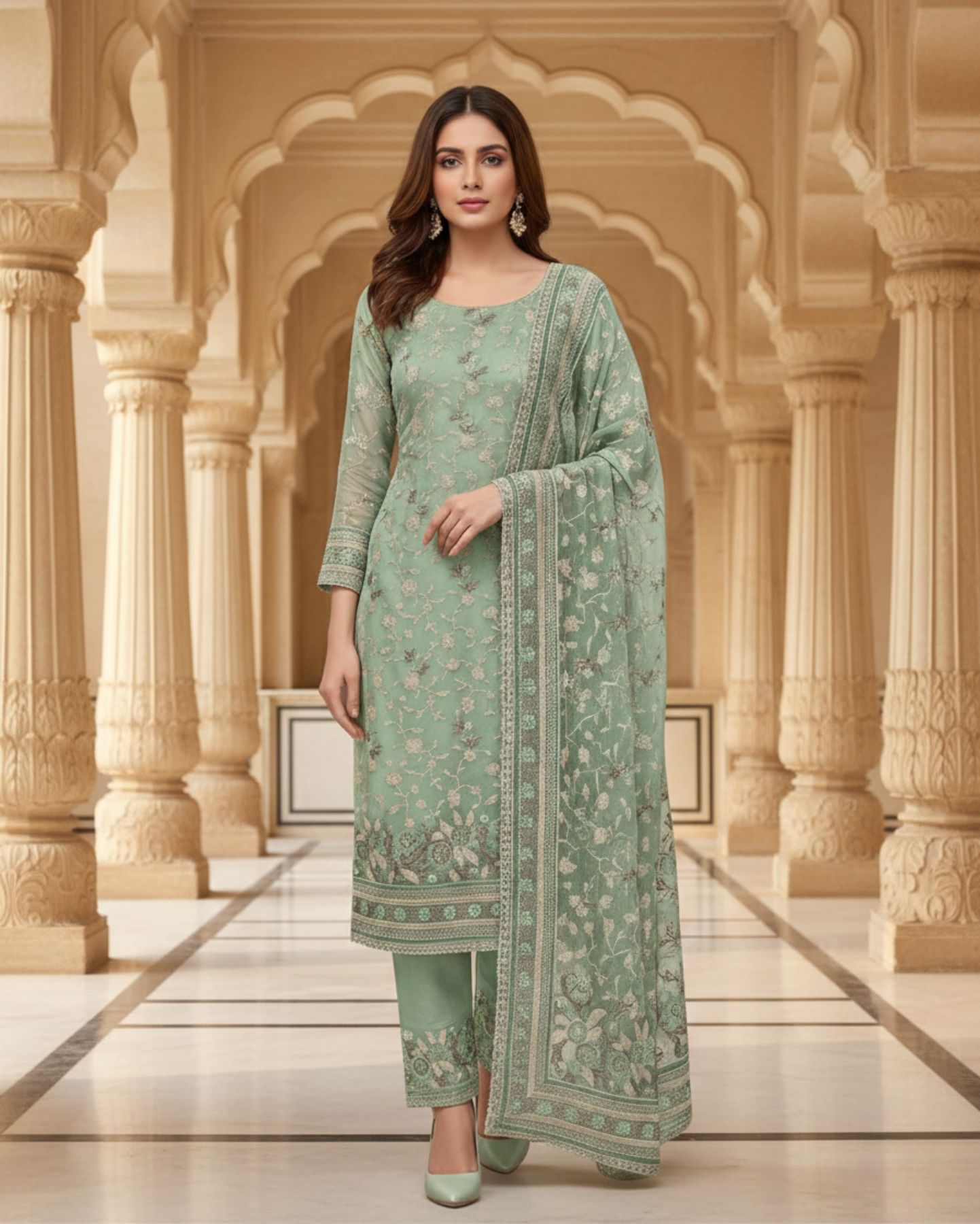 Unstitched Soft Sea-Green Organza Fabric Adorned With Delicate Ivory Thread Embroidered Suit Material