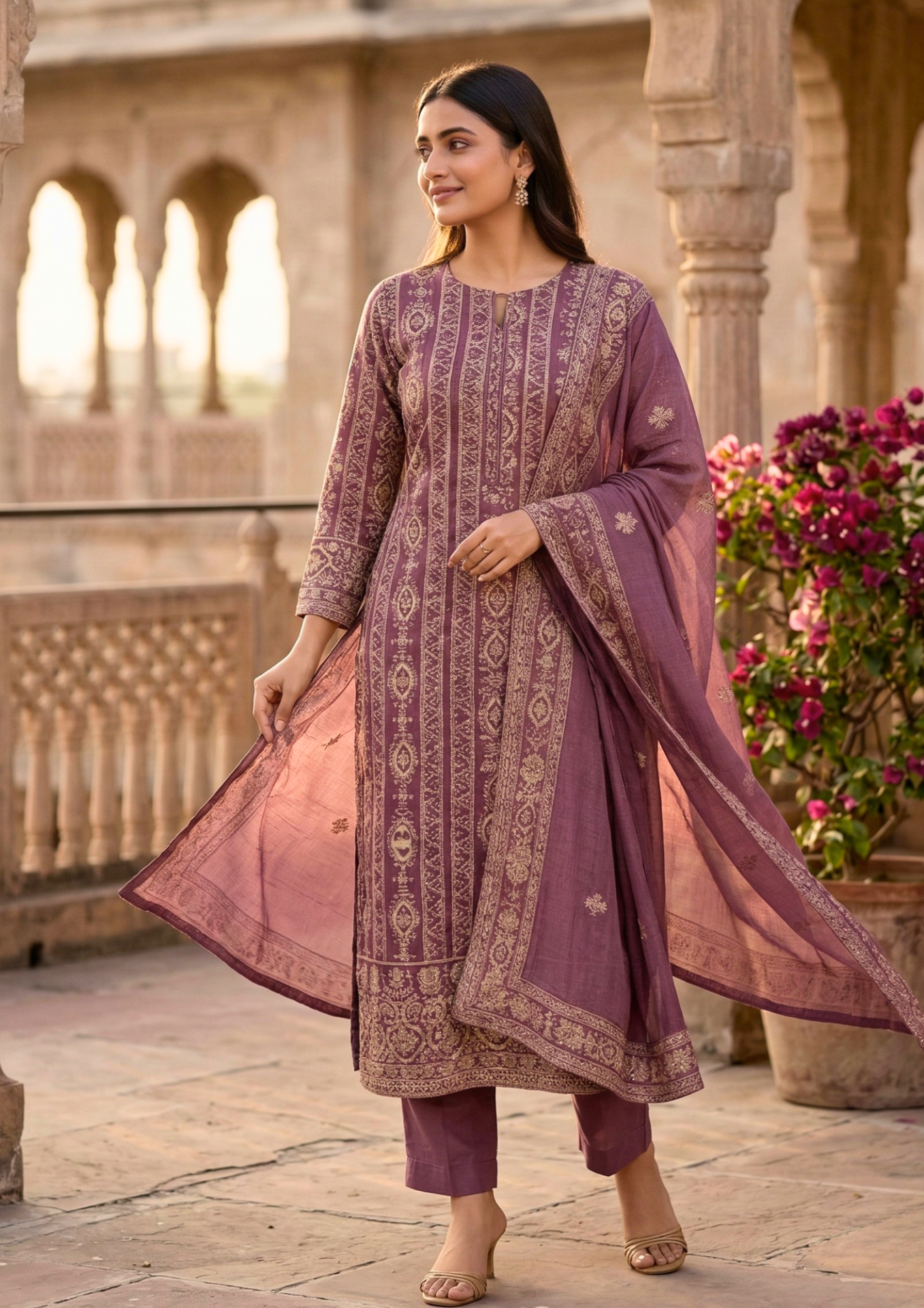 Unstitched Dusty Mauve-Purple Viscose-Georgette Fabric Adorned With Delicate Ivory Thread Embroidered Suit Material
