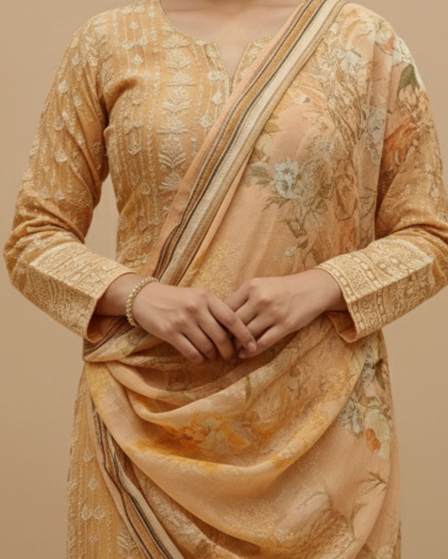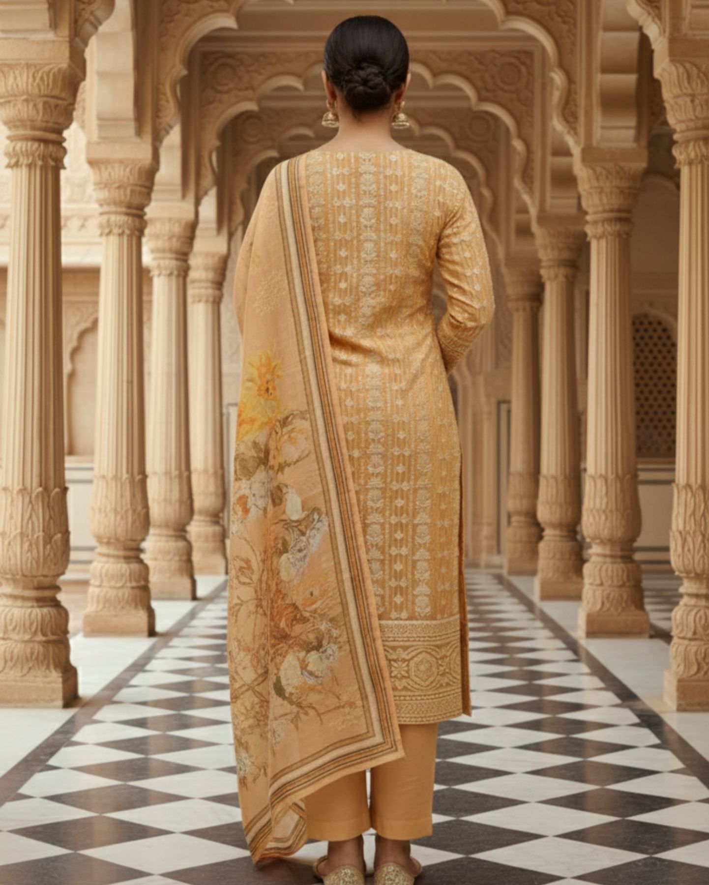 Unstitched Peach Blush Georgette Suit With Intricate White Resham Embroidery And Sequin Highlights