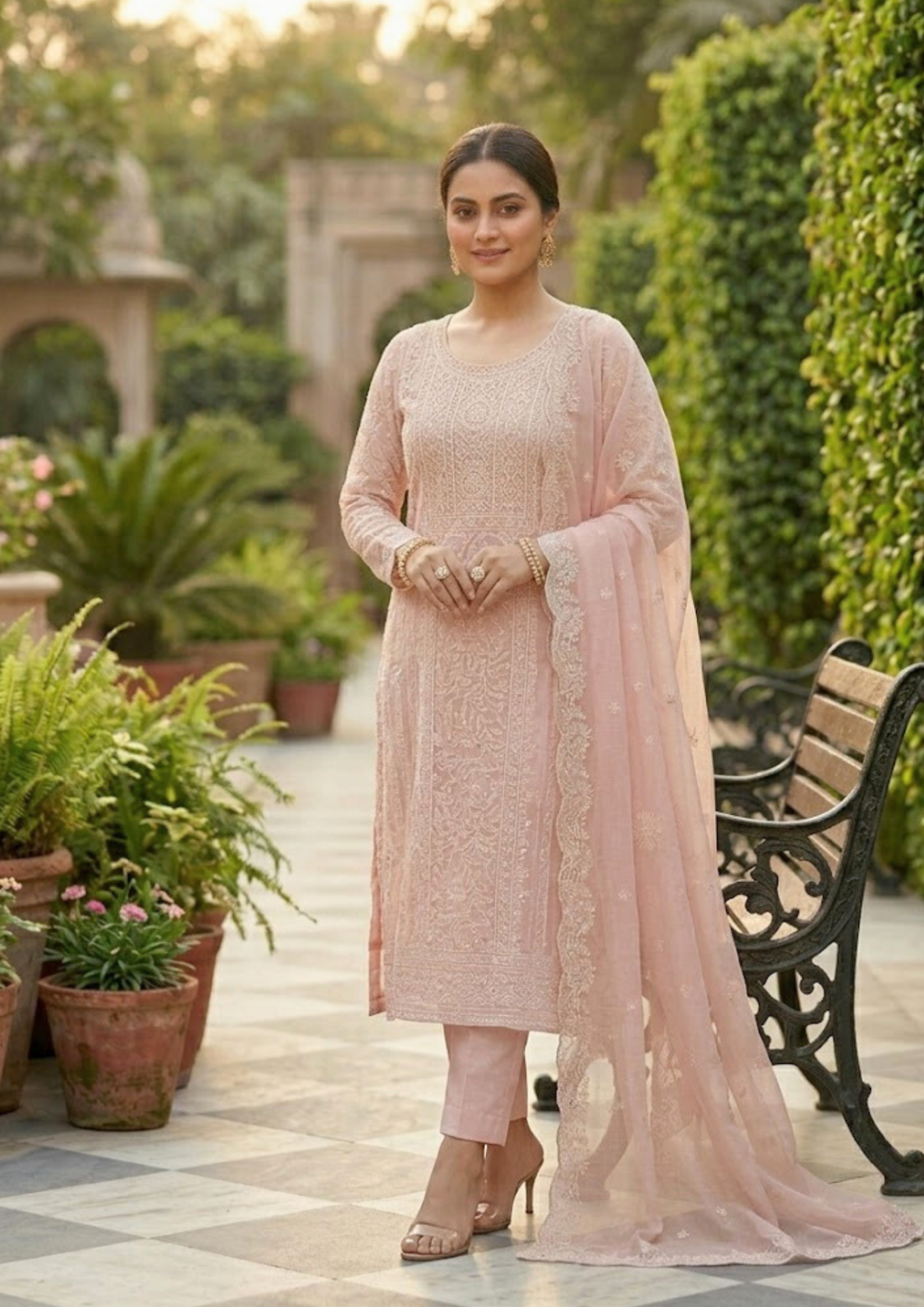 Semi-Stitched Soft Blush Pink Georgette Suit With Intricate Pastel Thread And Sequin Embroidery