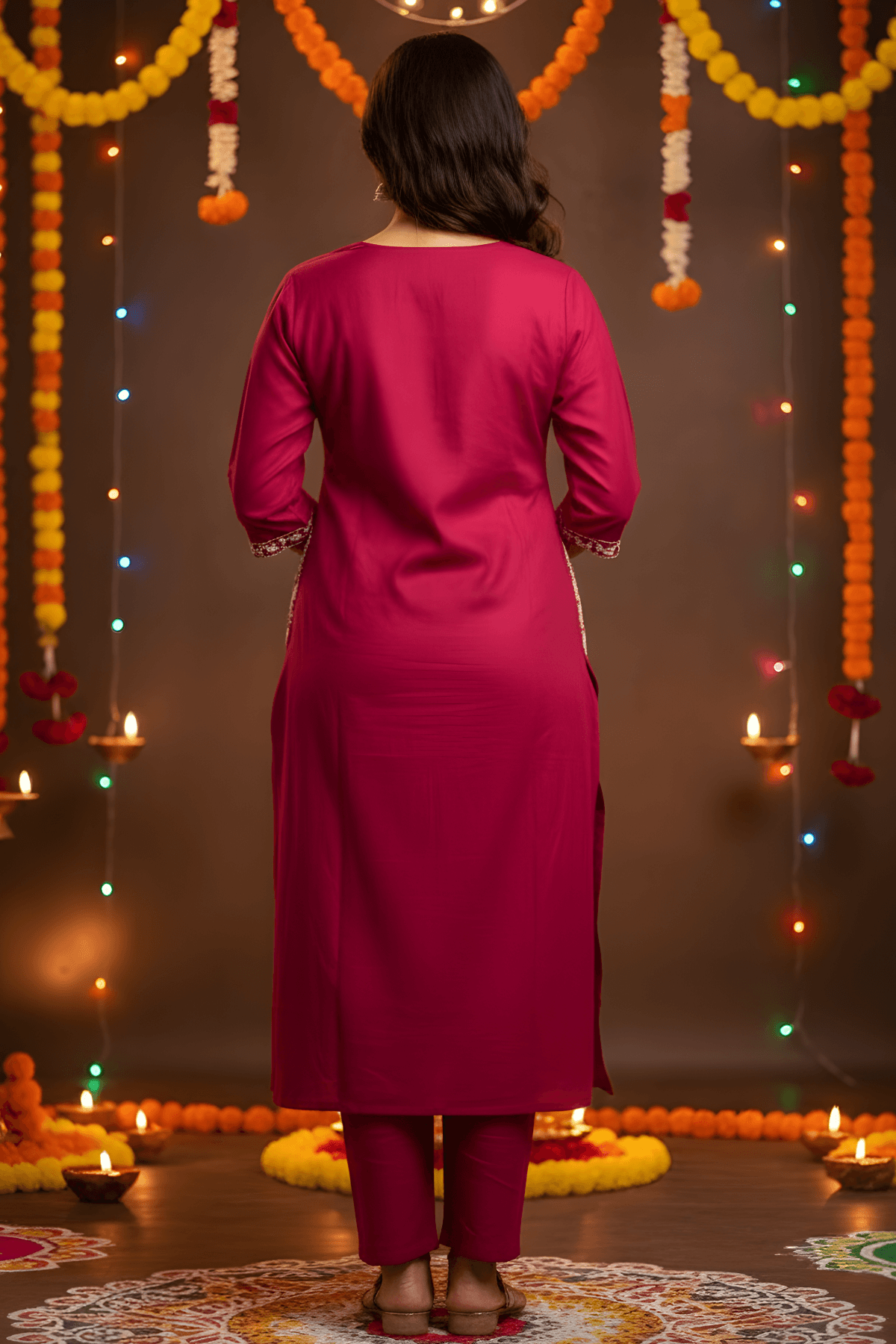 classique kurtiWine Cotton Kurta With Contrast Embroidery