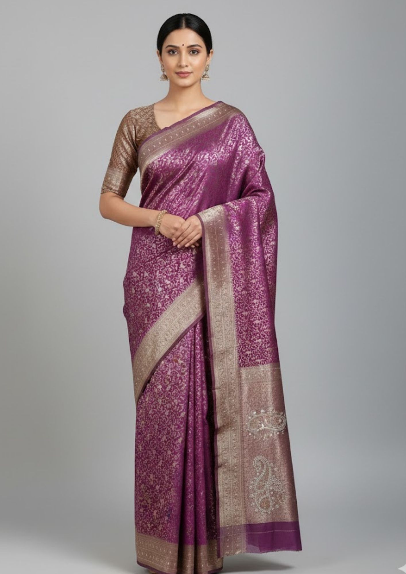 Mauve-rose Banarasi Silk Saree Woven With Rich Gold Zari Florals And Paisleys