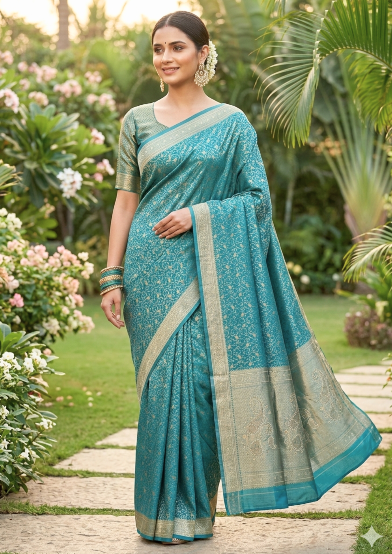 Teal Blue With Silver–Gold Zari And Paisley Border Banarasi Silk Saree