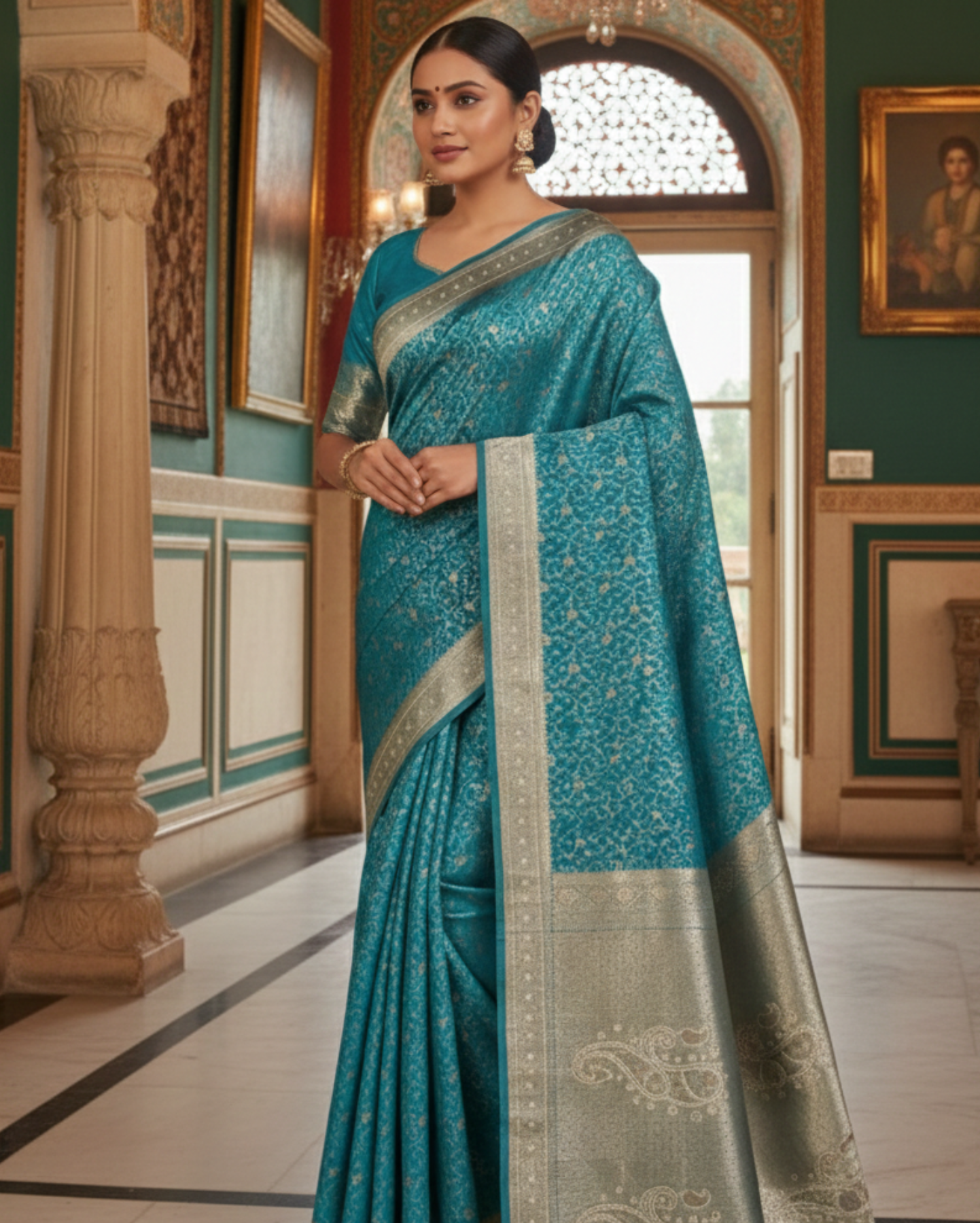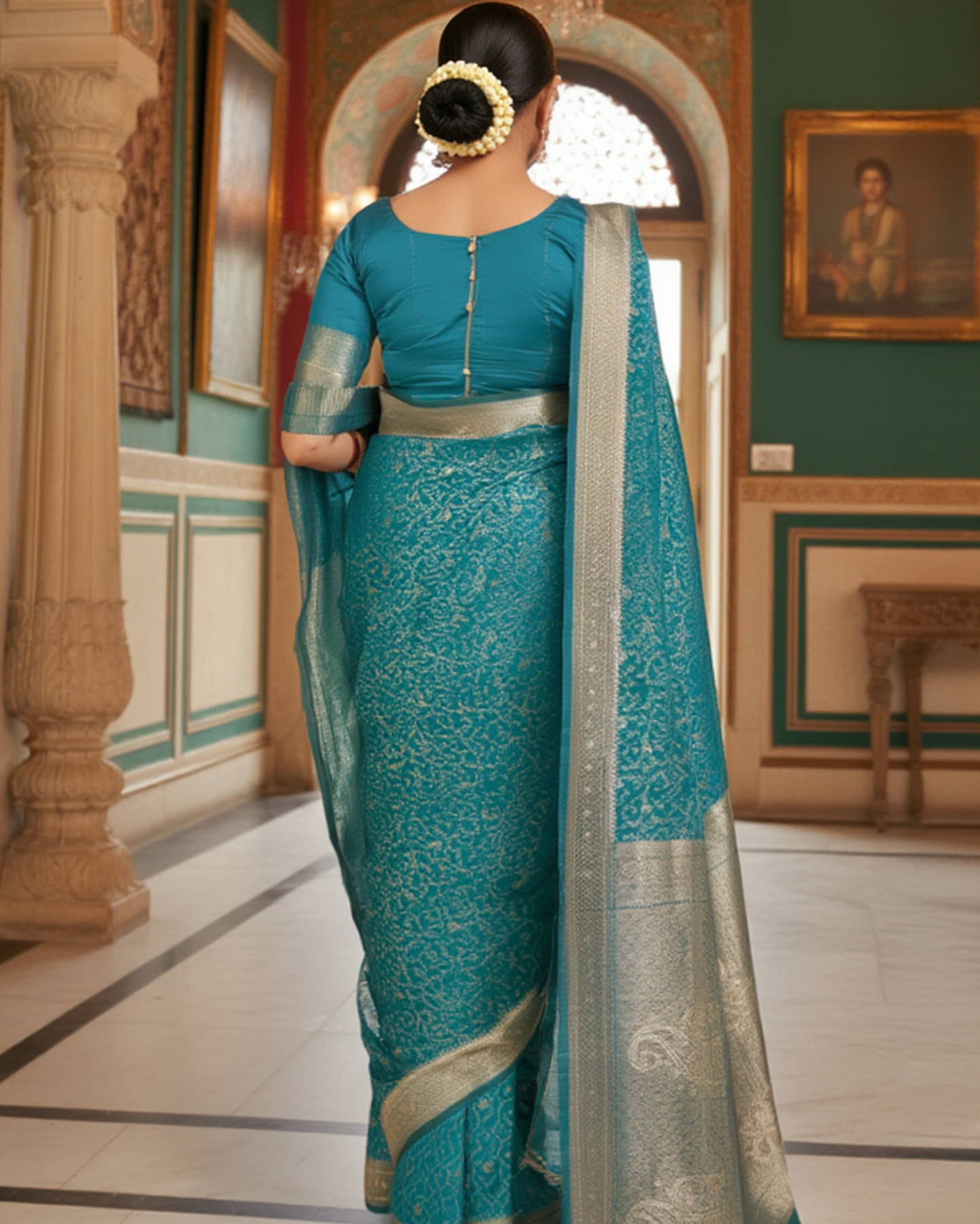 Lagoon Blue With Zari Floral And Paisley Motifs Banarasi Silk Saree