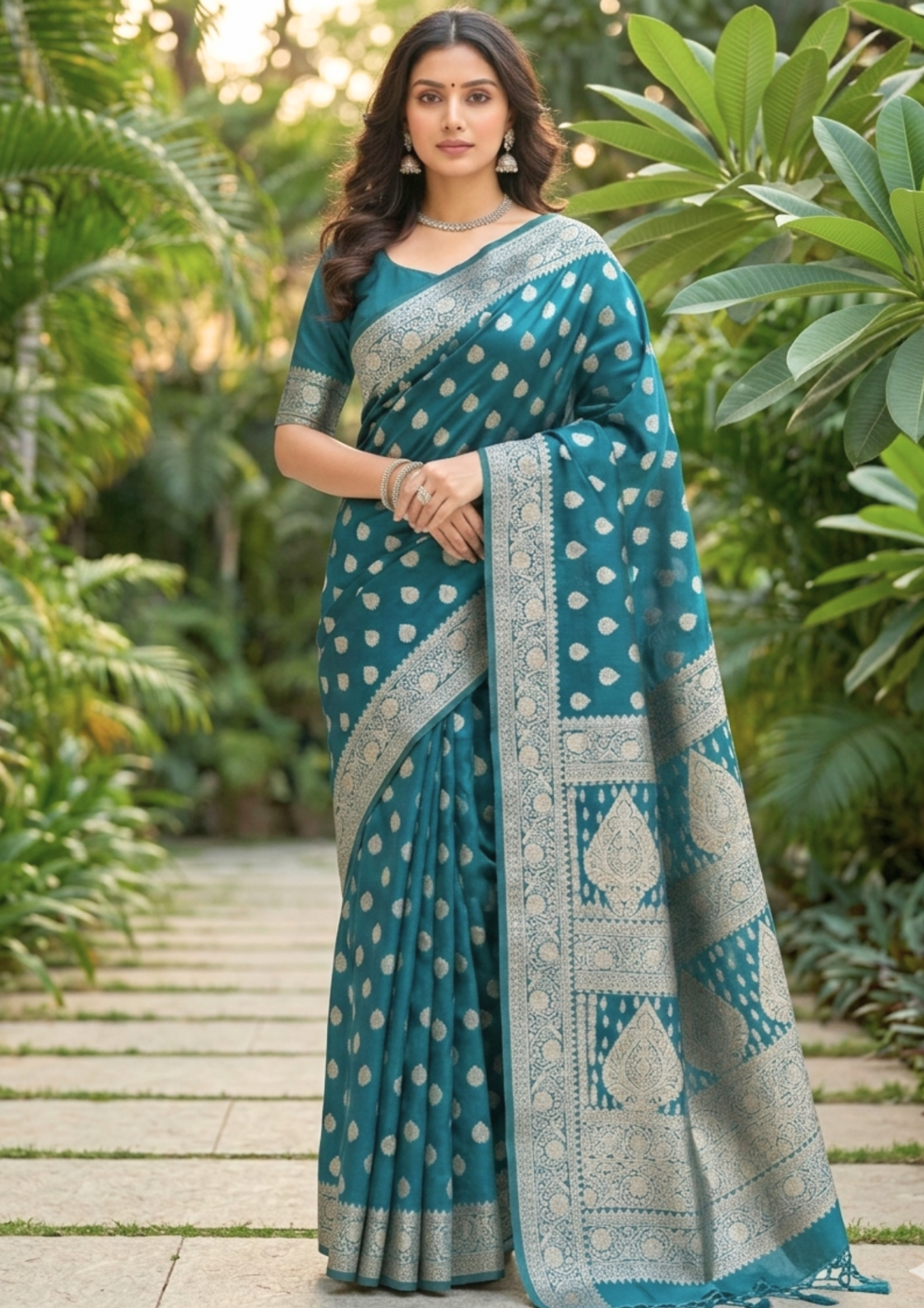 Deep Teal Banarasi Brocade With Intricate Antique-Gold Floral Weaving.