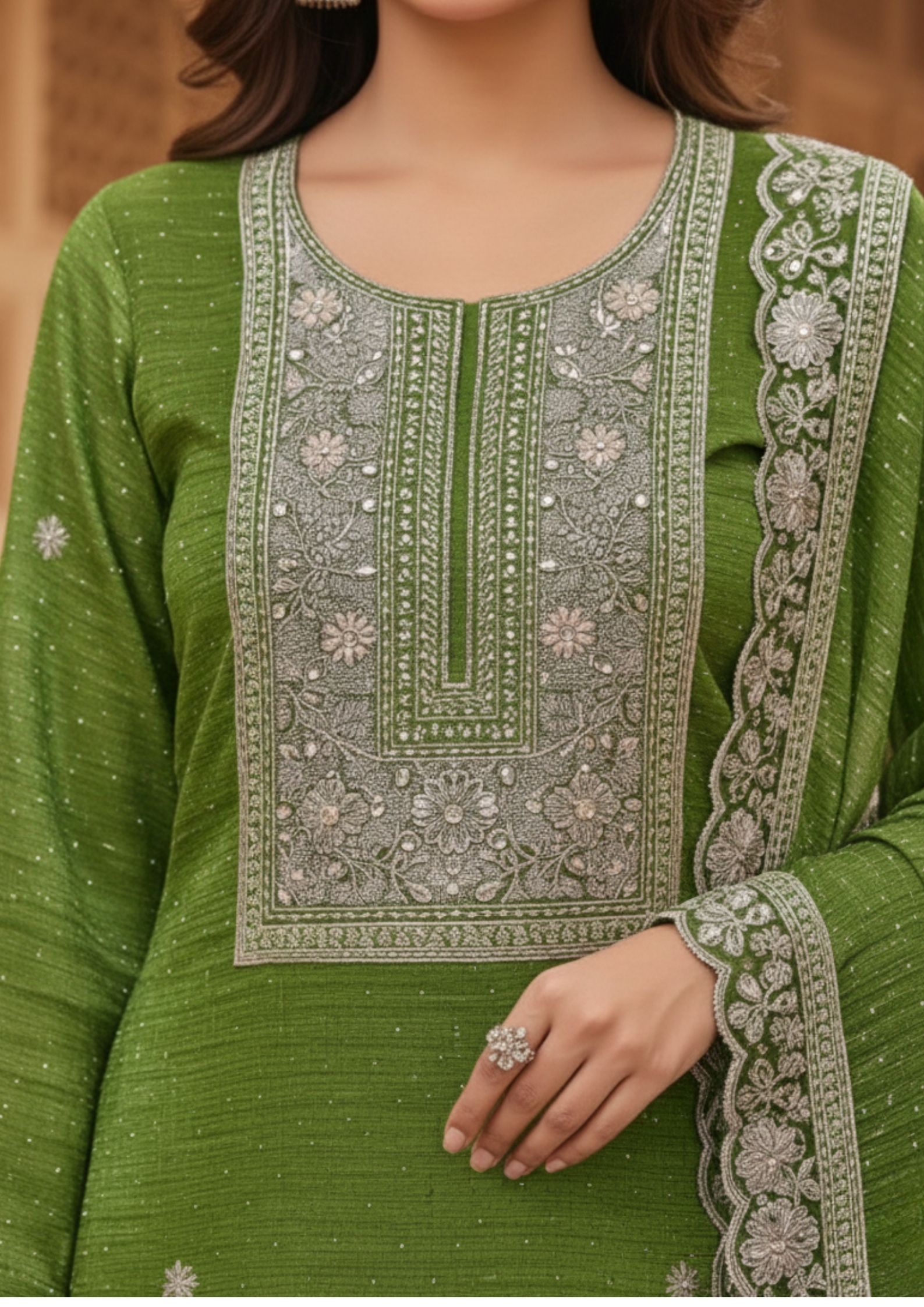 Semi-Stitched A refreshing pista-green organza suit with subtle shimmer and scattered stone embellishments