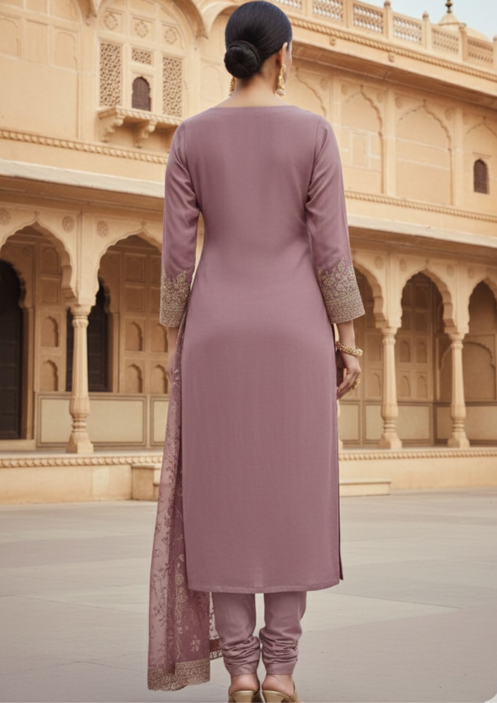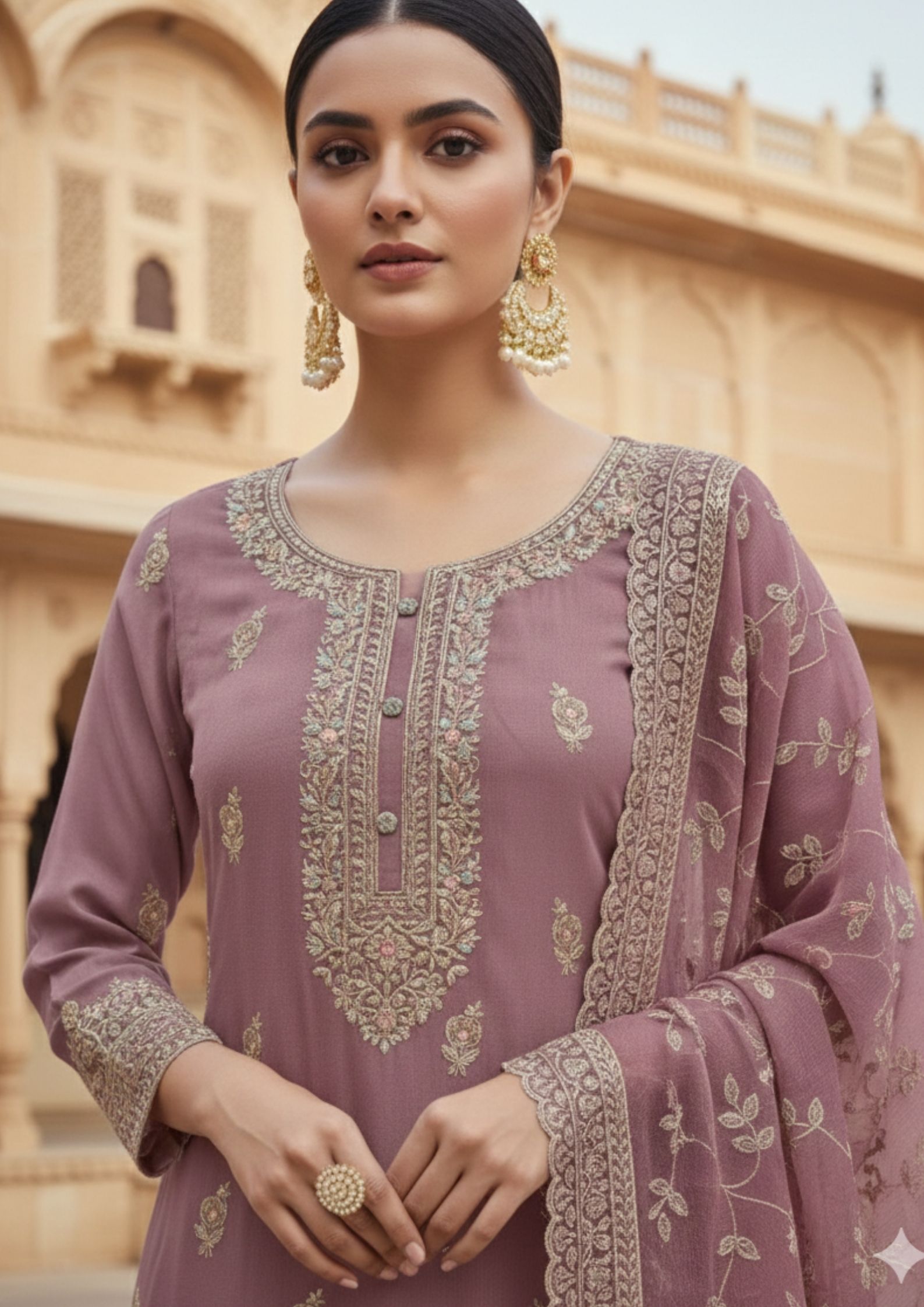 Semi-Stitched Dusty mauve chiffon suit with delicate golden thread and sequin embroidery