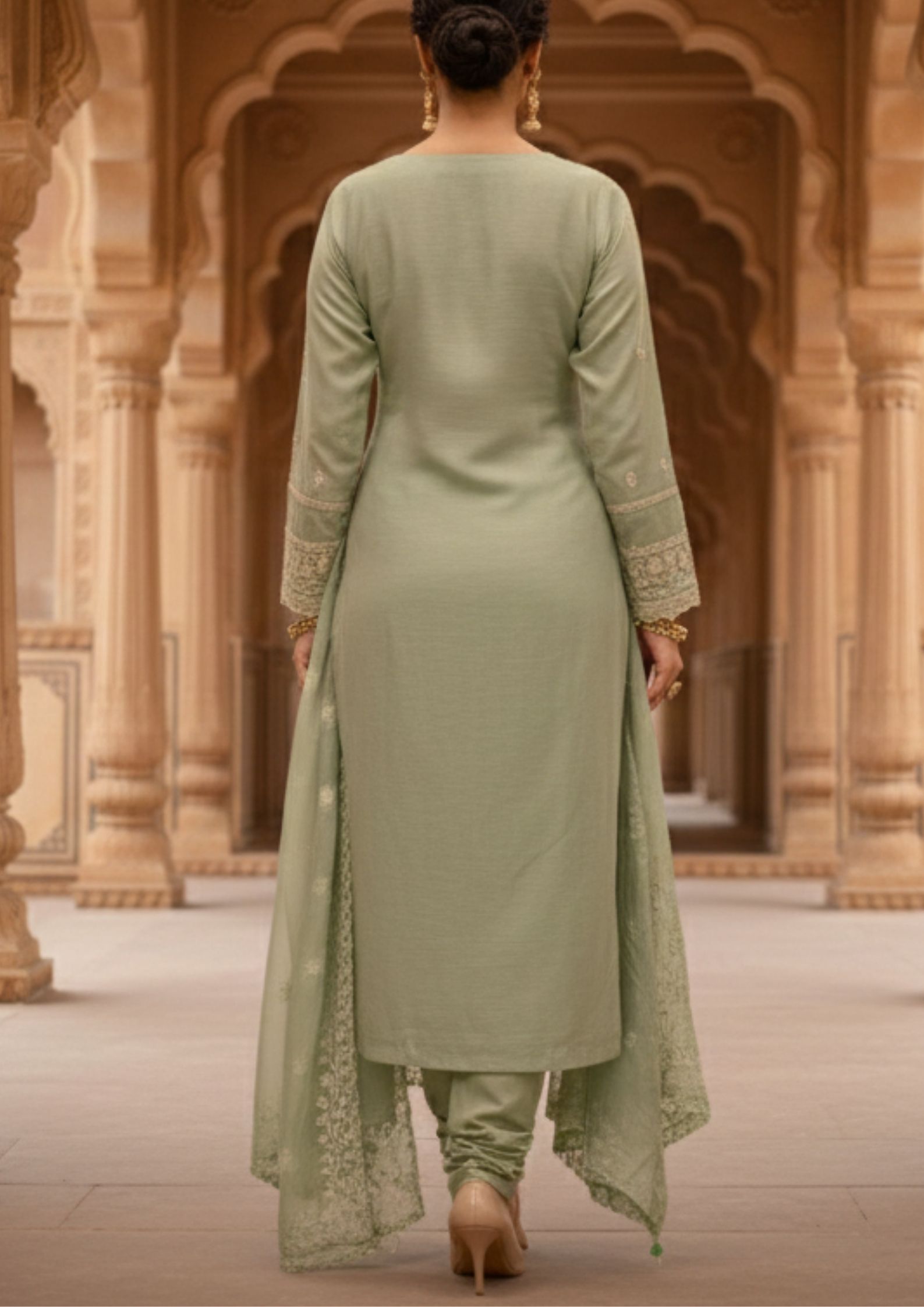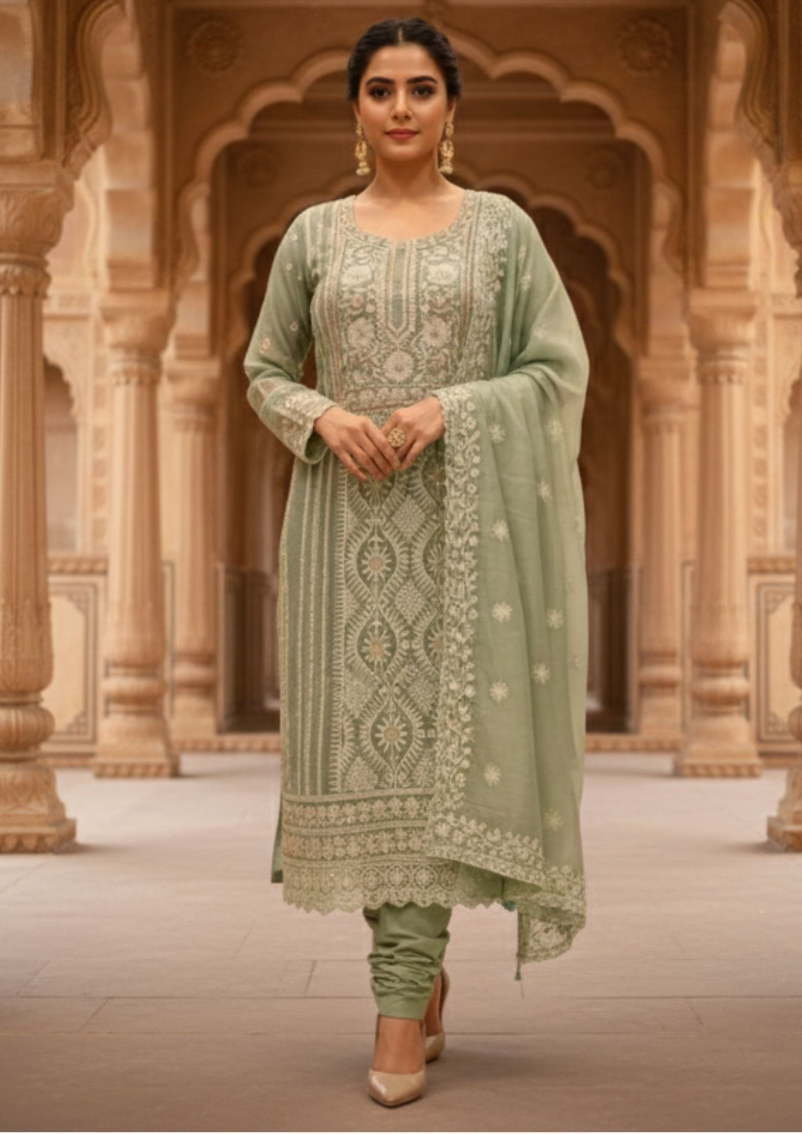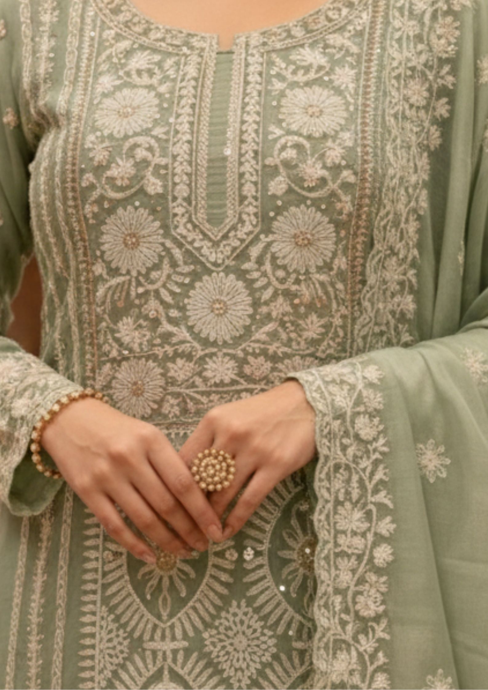 Semi-Stitched Soft pastel mint green organza suit with intricate white thread and golden sequin embroidery