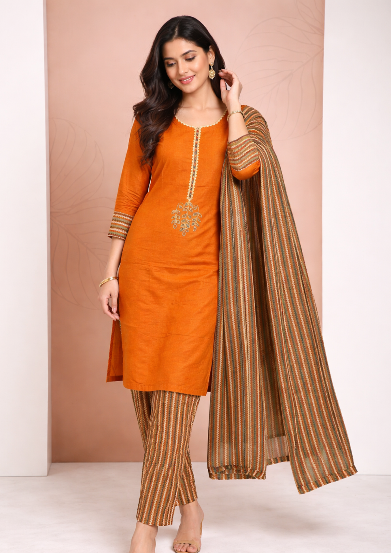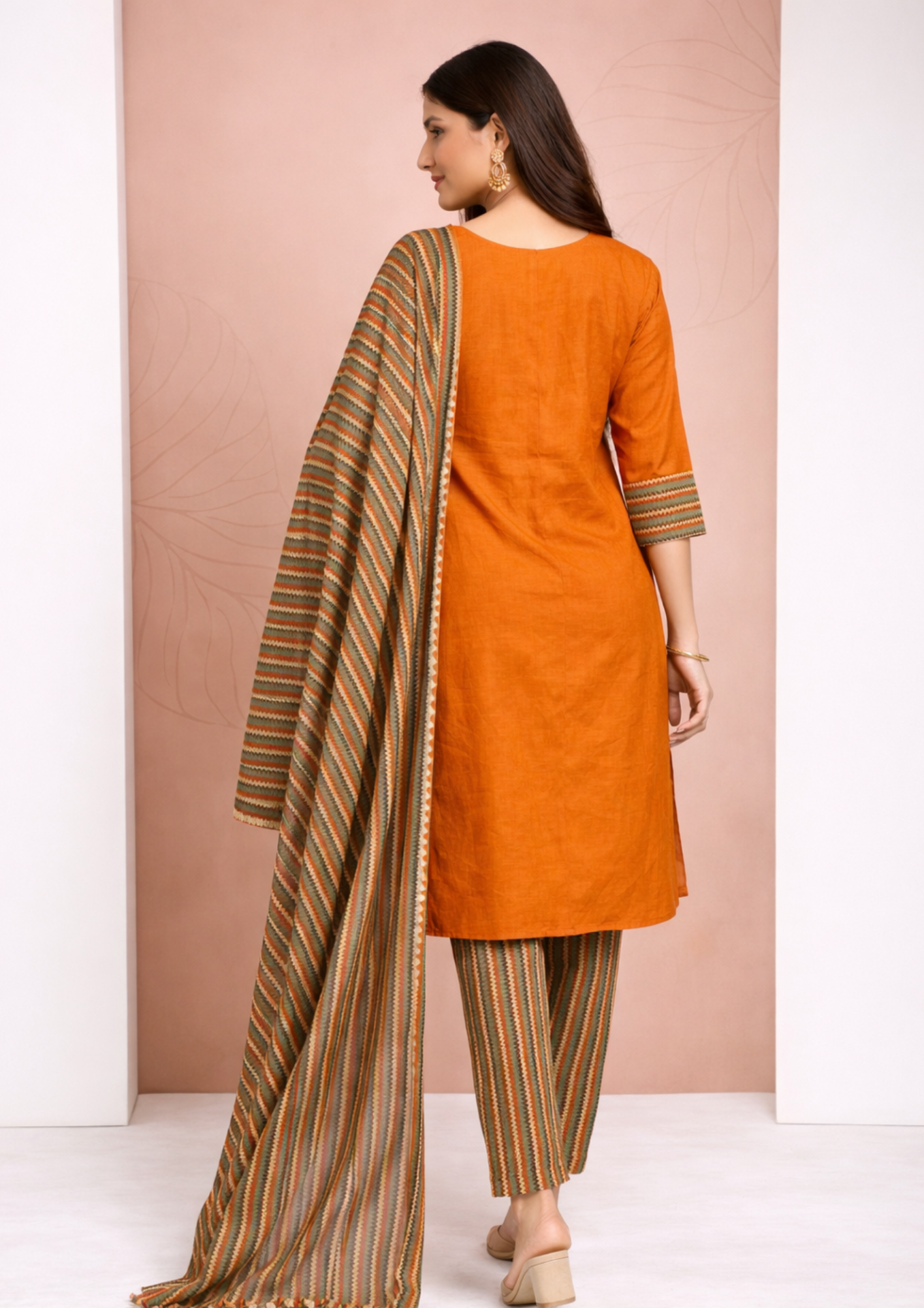 Rust Orange Cotton Kurta Pant Set with printed dupatta