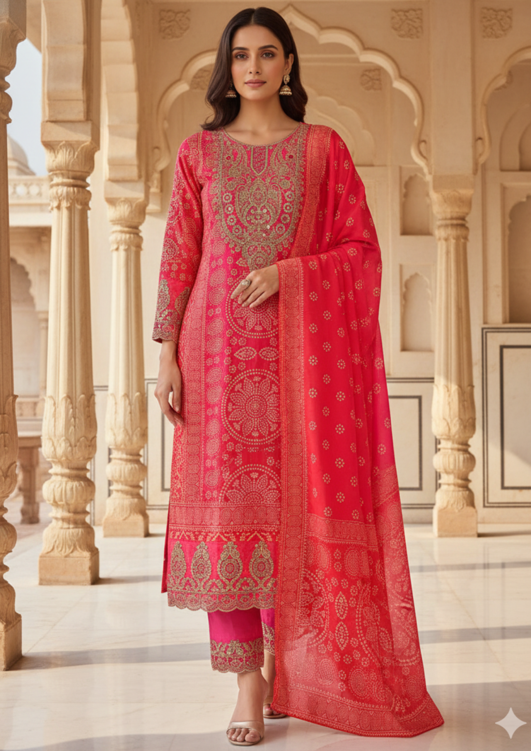 Hot Pink Embroidered Chinon Bandhani Kurta Set With A Vibrant Dupatta