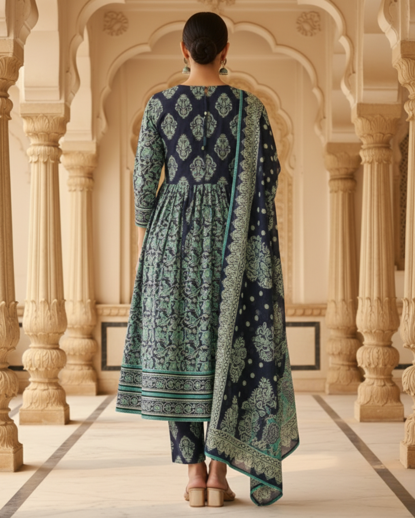 navy blue sangneri print cotton lawn suit set with a coordinated dupattaNavy Blue Sangneri Print Cotton Lawn Suit Set With a Coordinated Dupatta