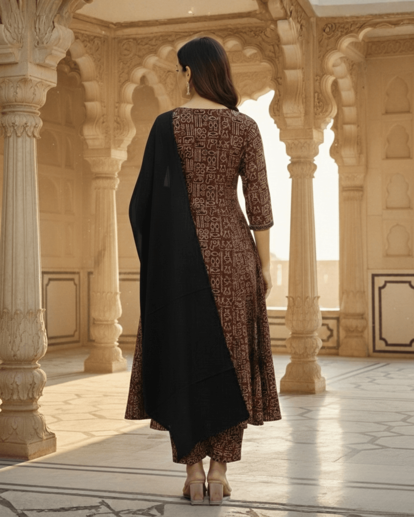Brown Printed Cotton Anarkali Suit With Solid Black Dupatta