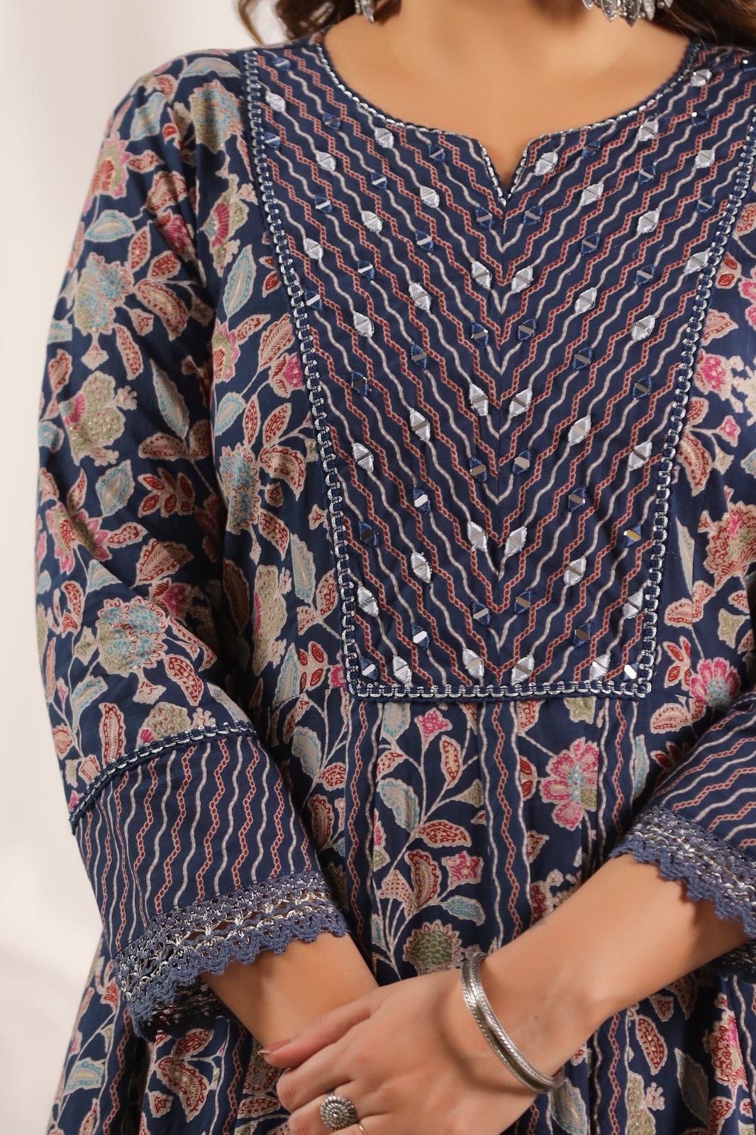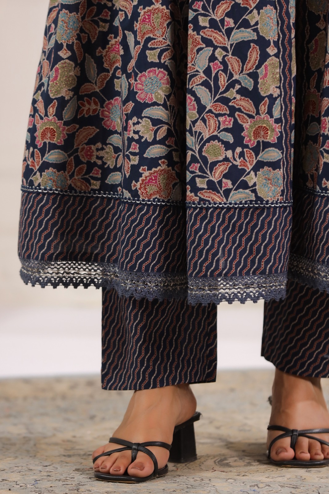 Purple Cotton Floral Handblock Sangneri Flared Suit Set With Dupatta