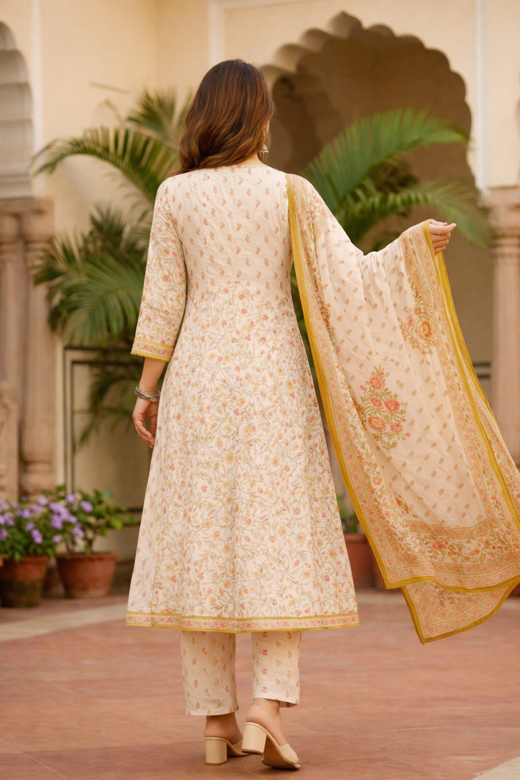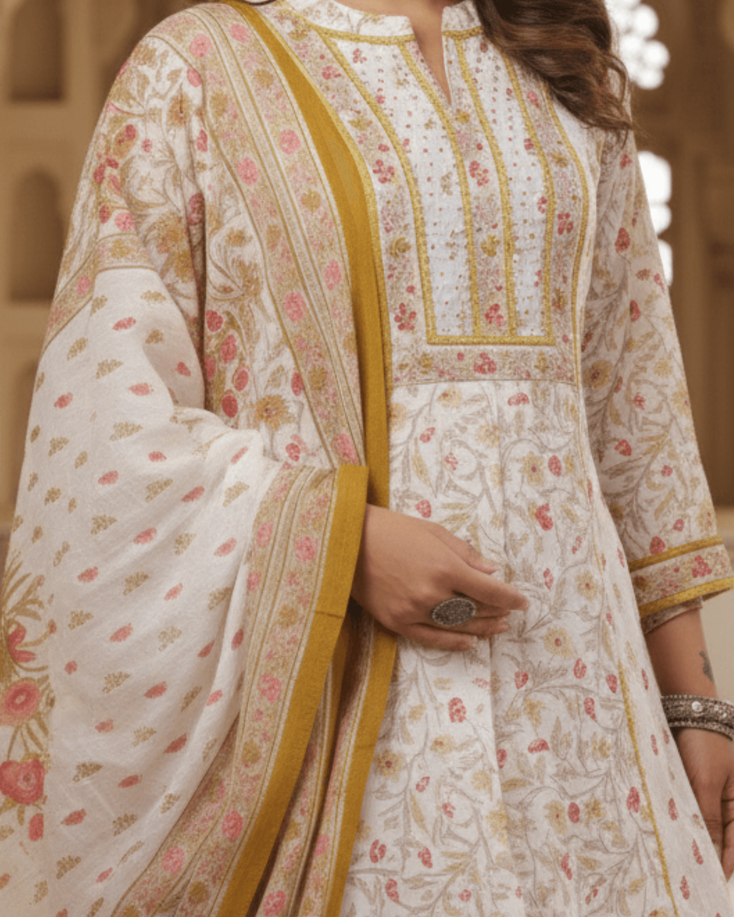 White Cotton Floral Suit Set With Yellow And Pink Accents Paired With Dupatta
