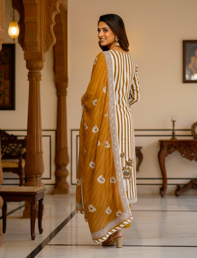 Brown Striped Floral Printed Rayon Kurta Set With Dupatta