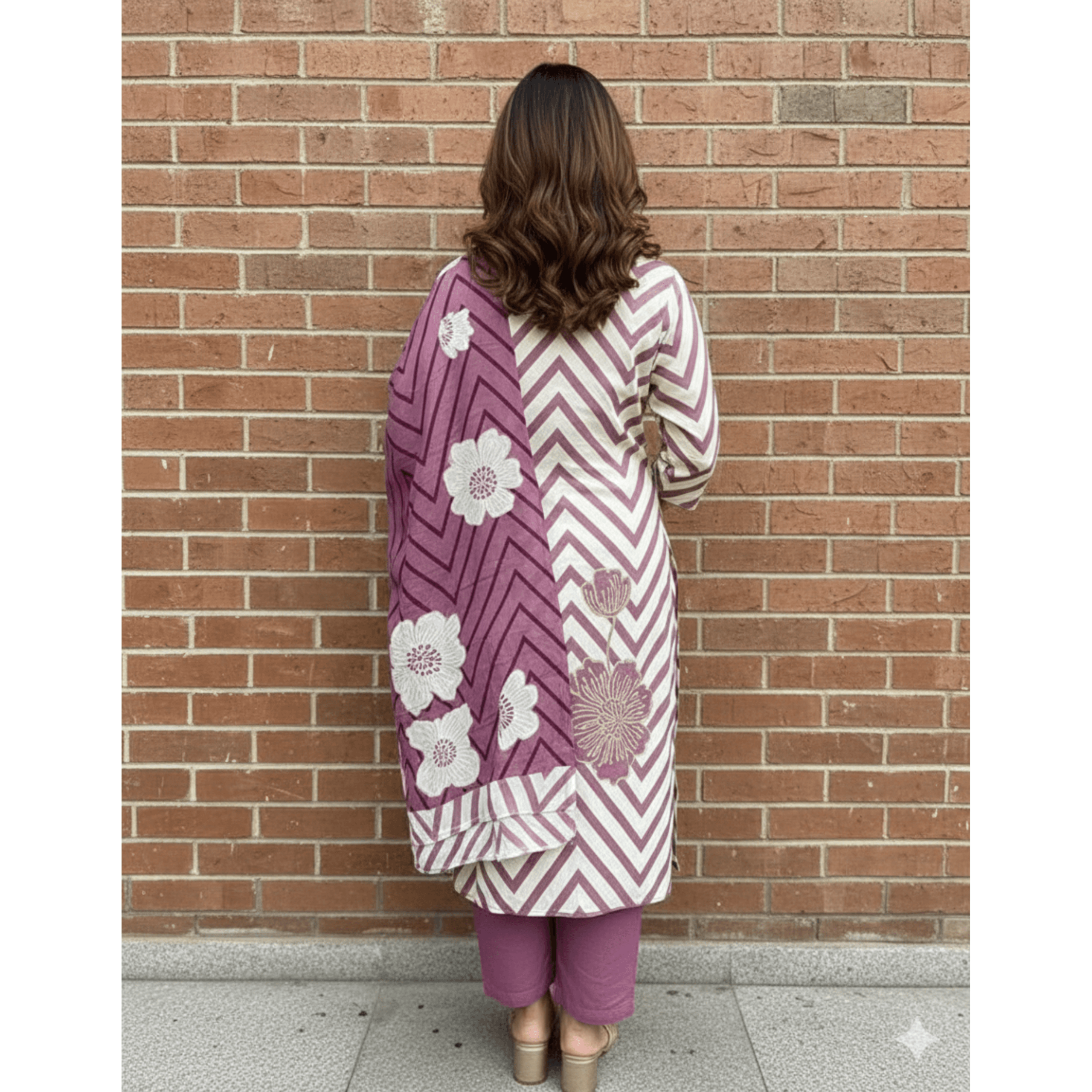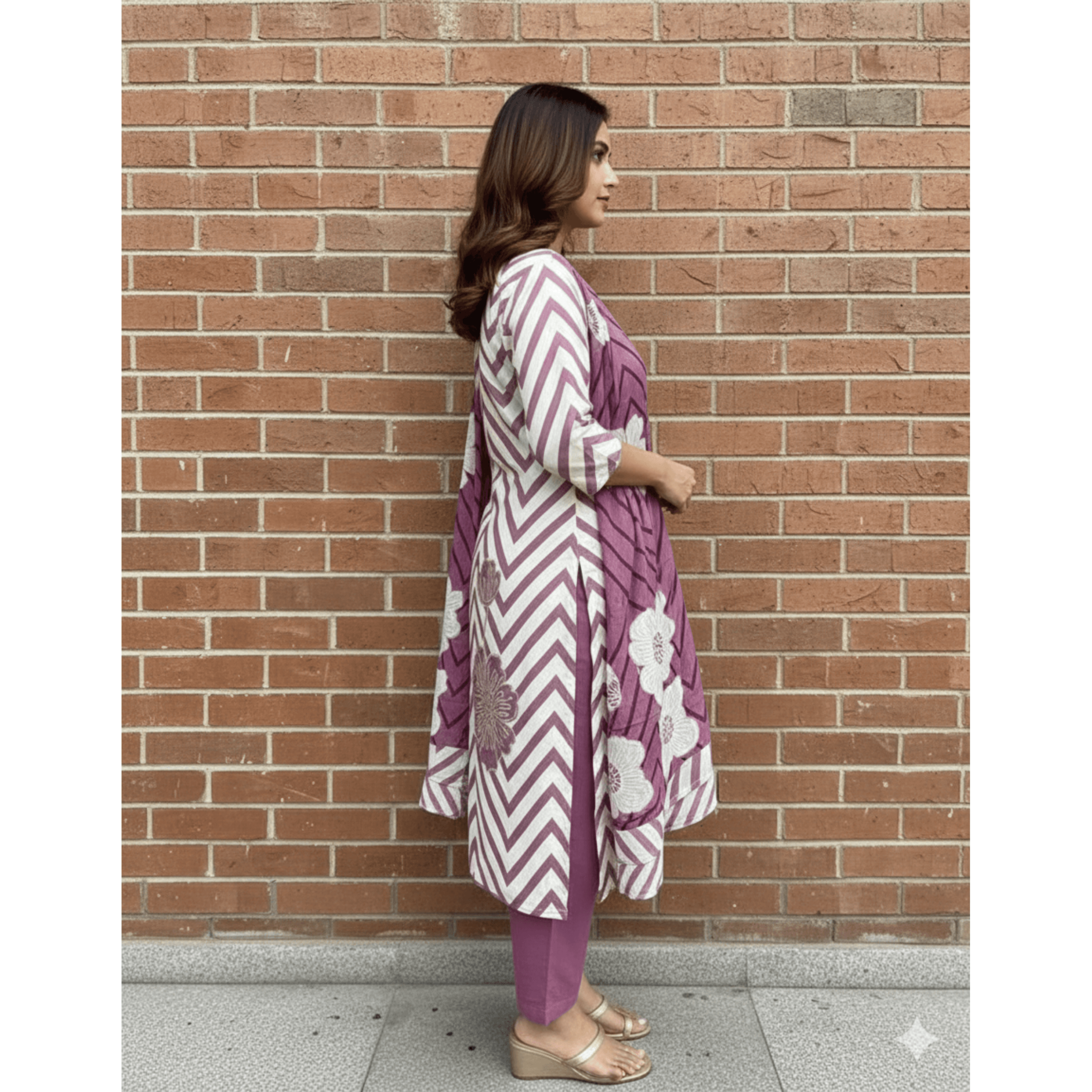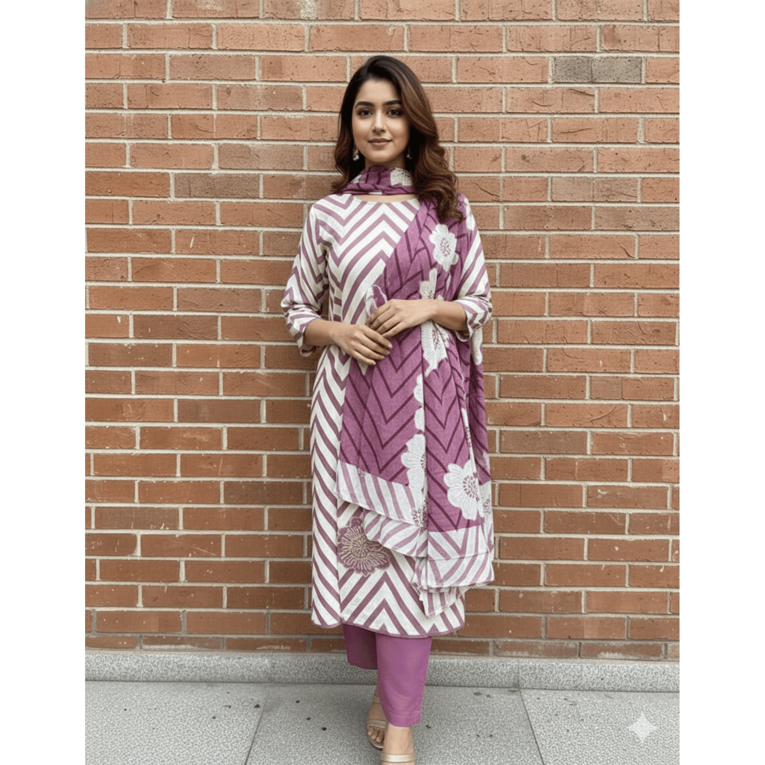 heritage glam ensemblePurple Striped Floral Printed Rayon Kurta Set With Dupatta