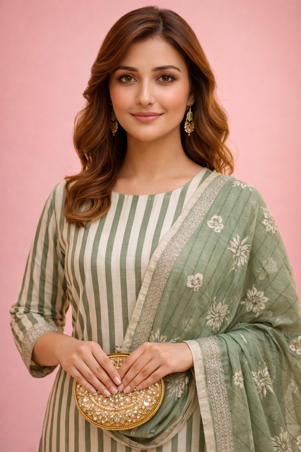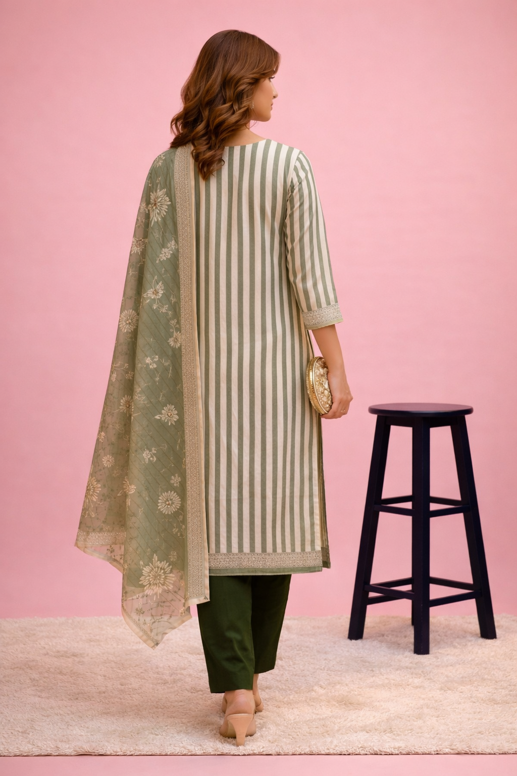 Green Striped Floral Printed Rayon Kurta Set With Dupatta