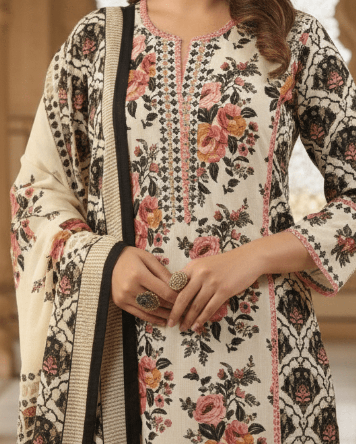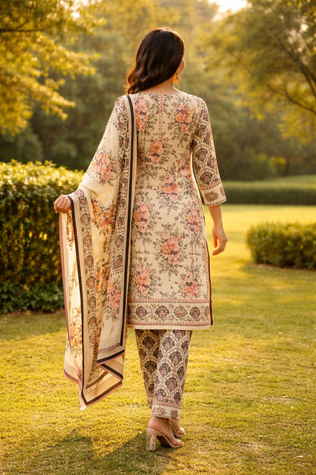 Coral Detailed Cream Floral Bagru Printed Cotton Kurta Set With Dupatta