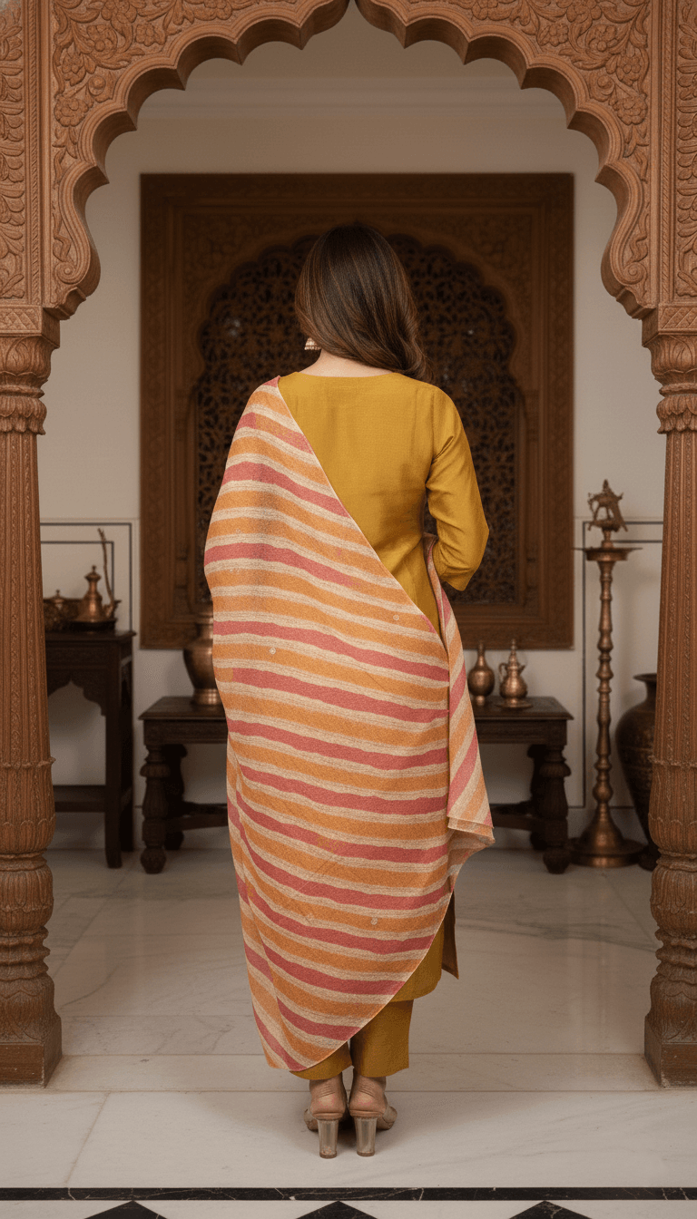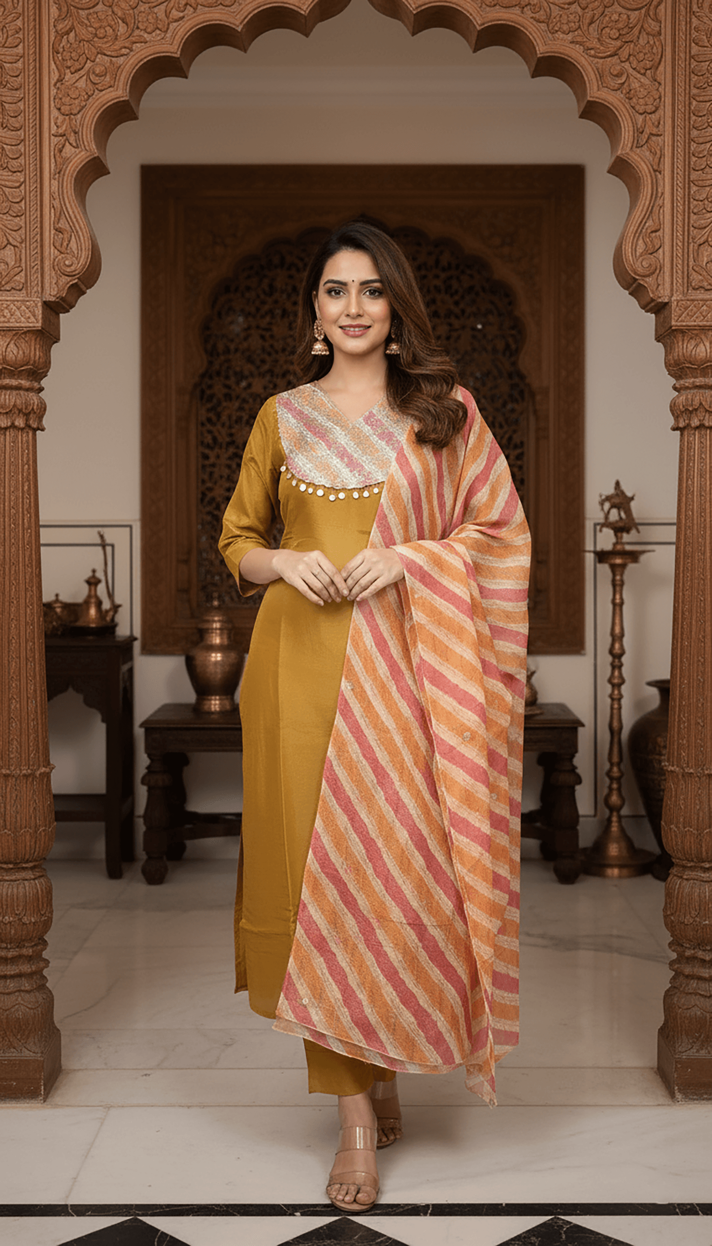 Golden Chinon Brocade Base Festive Kurta Set With Dupatta