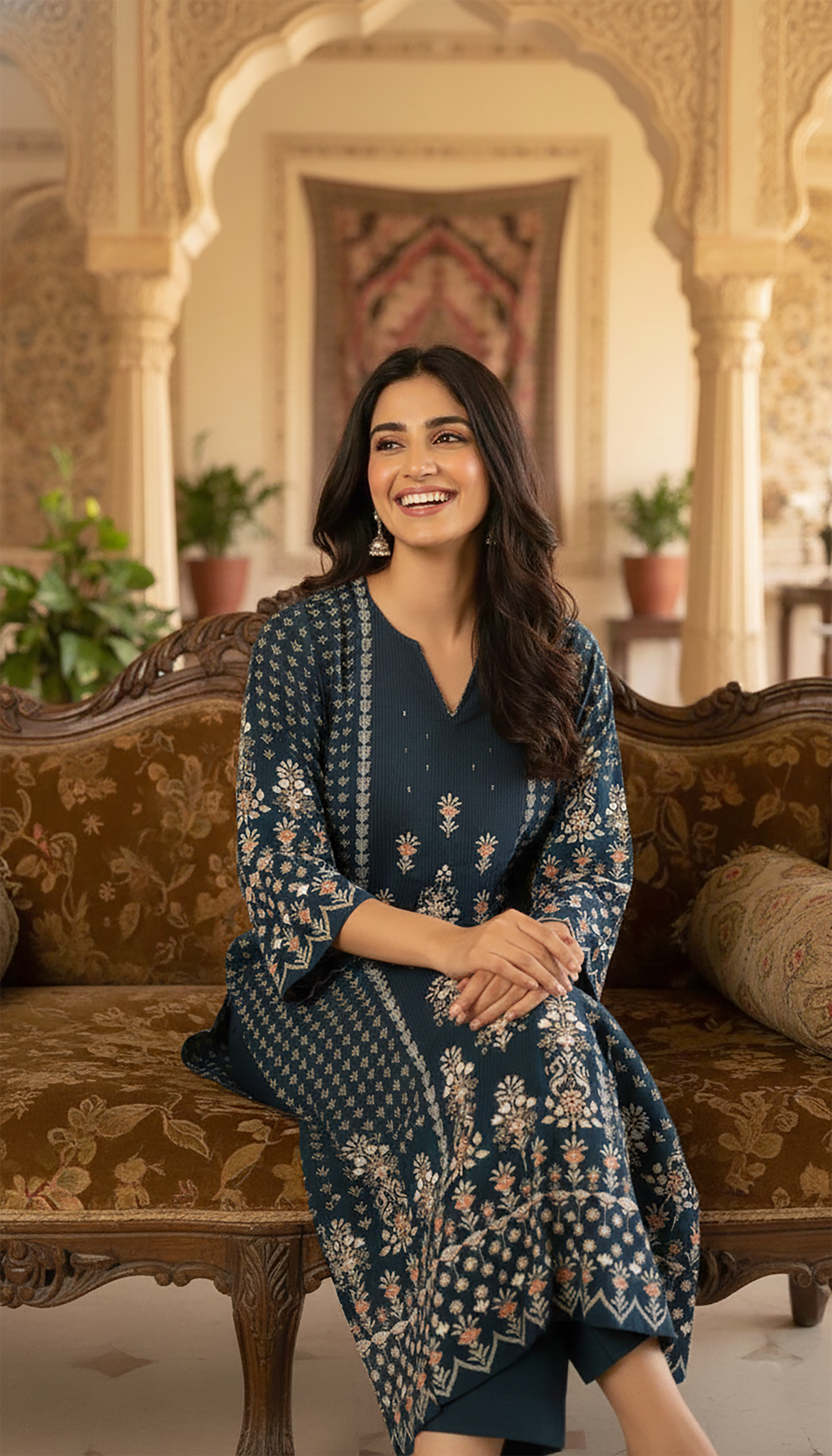 Navy Poly Silk With Subtle Detailing Kurta Set With Dupatta