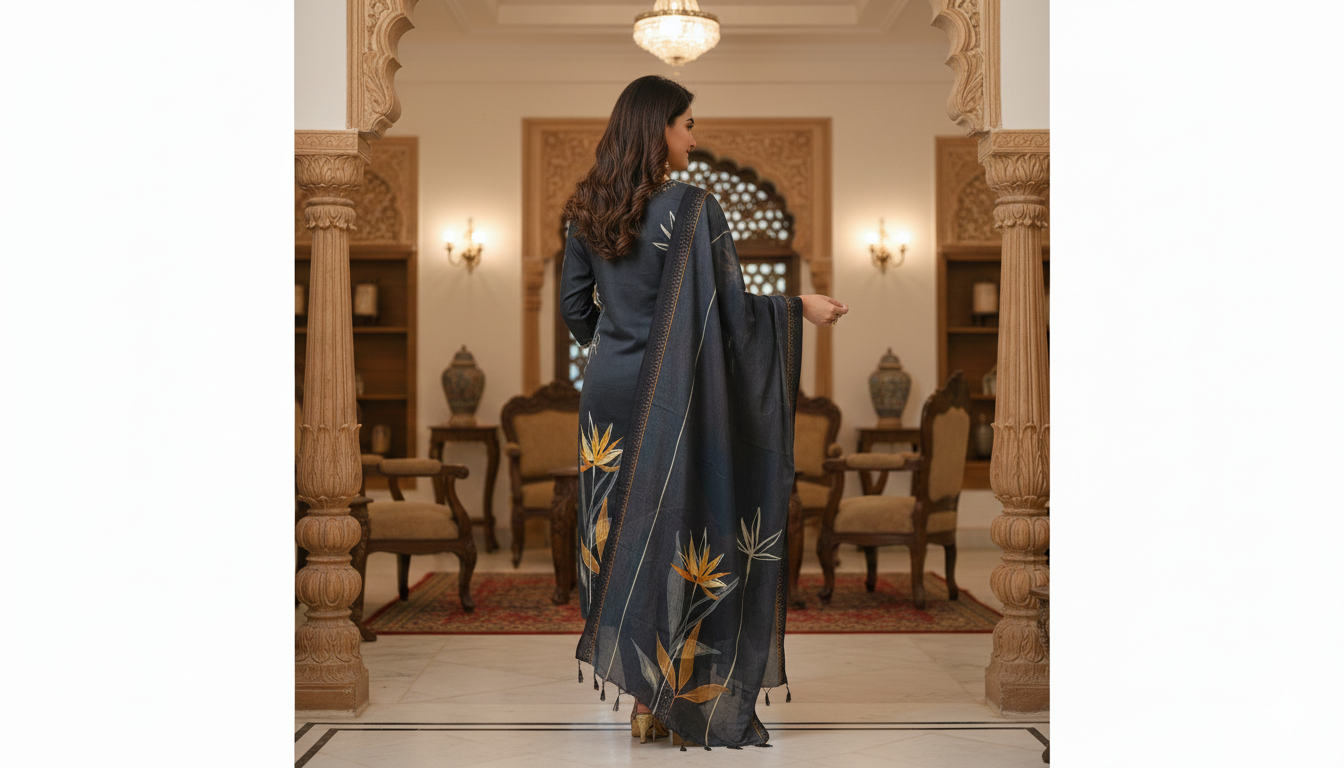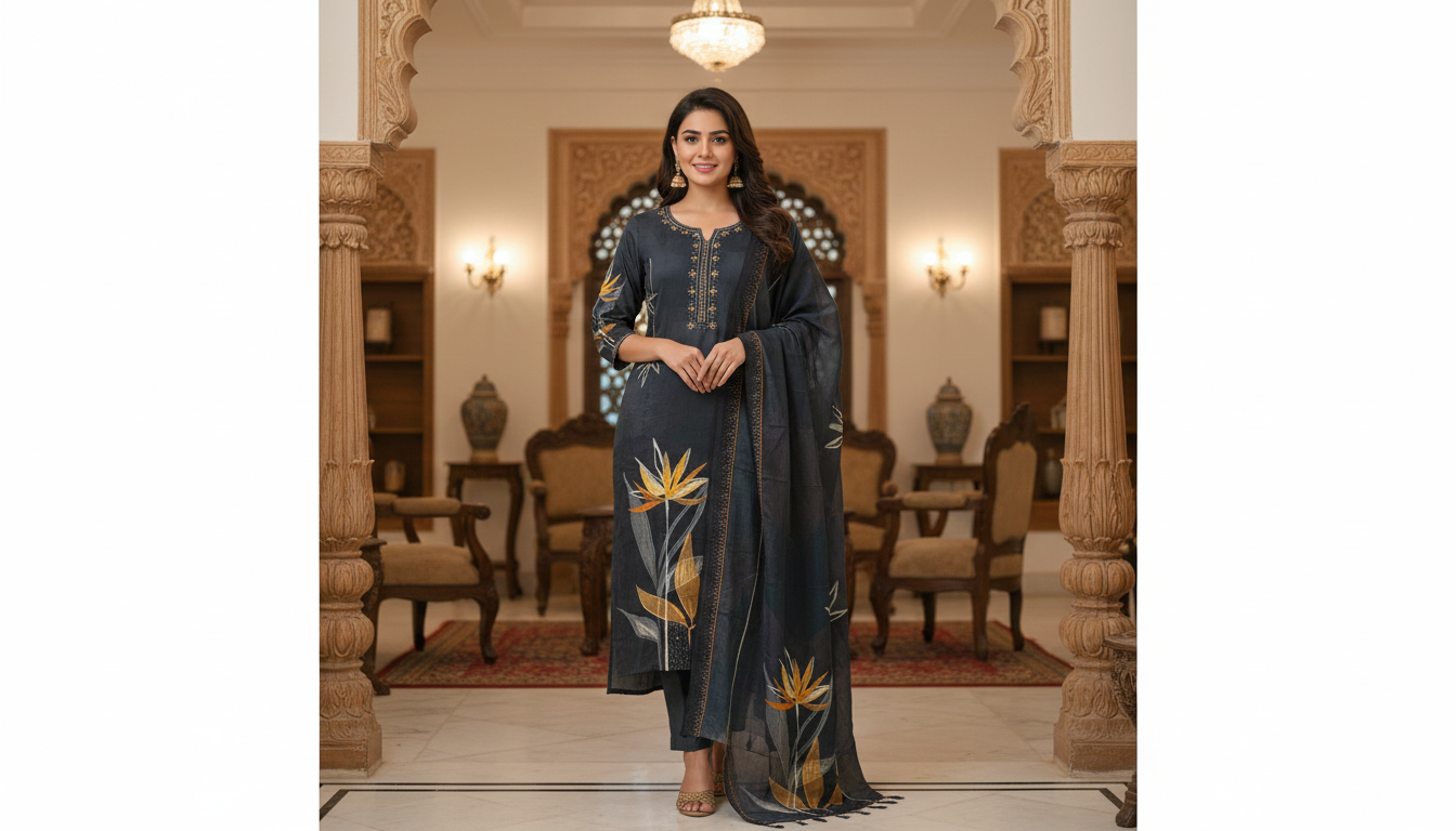 heritage glam ensembleEmbroidered Neckline Soft Grey Rayon Kurta Set With Dupatta