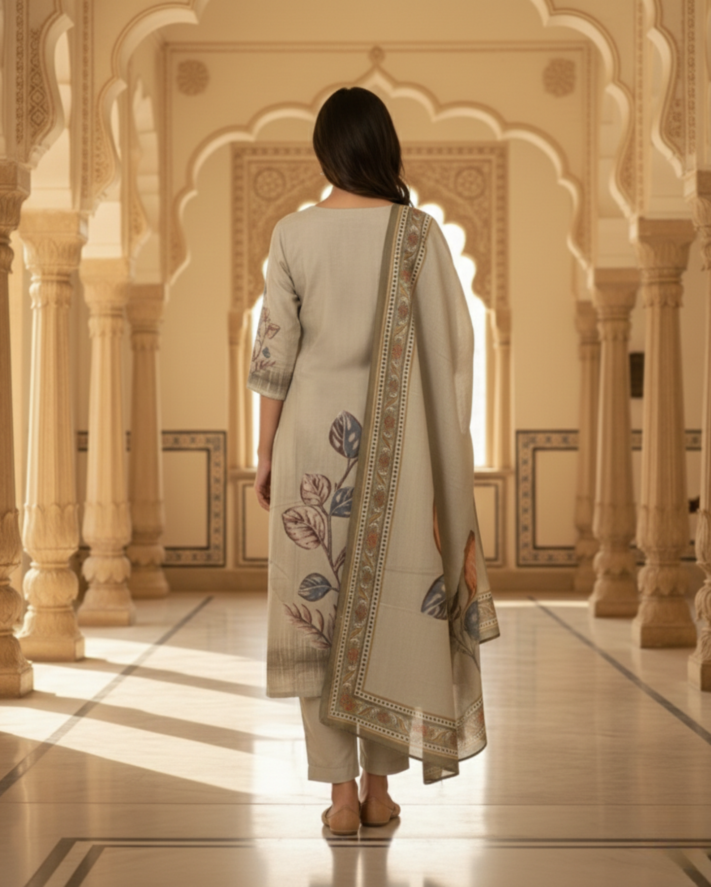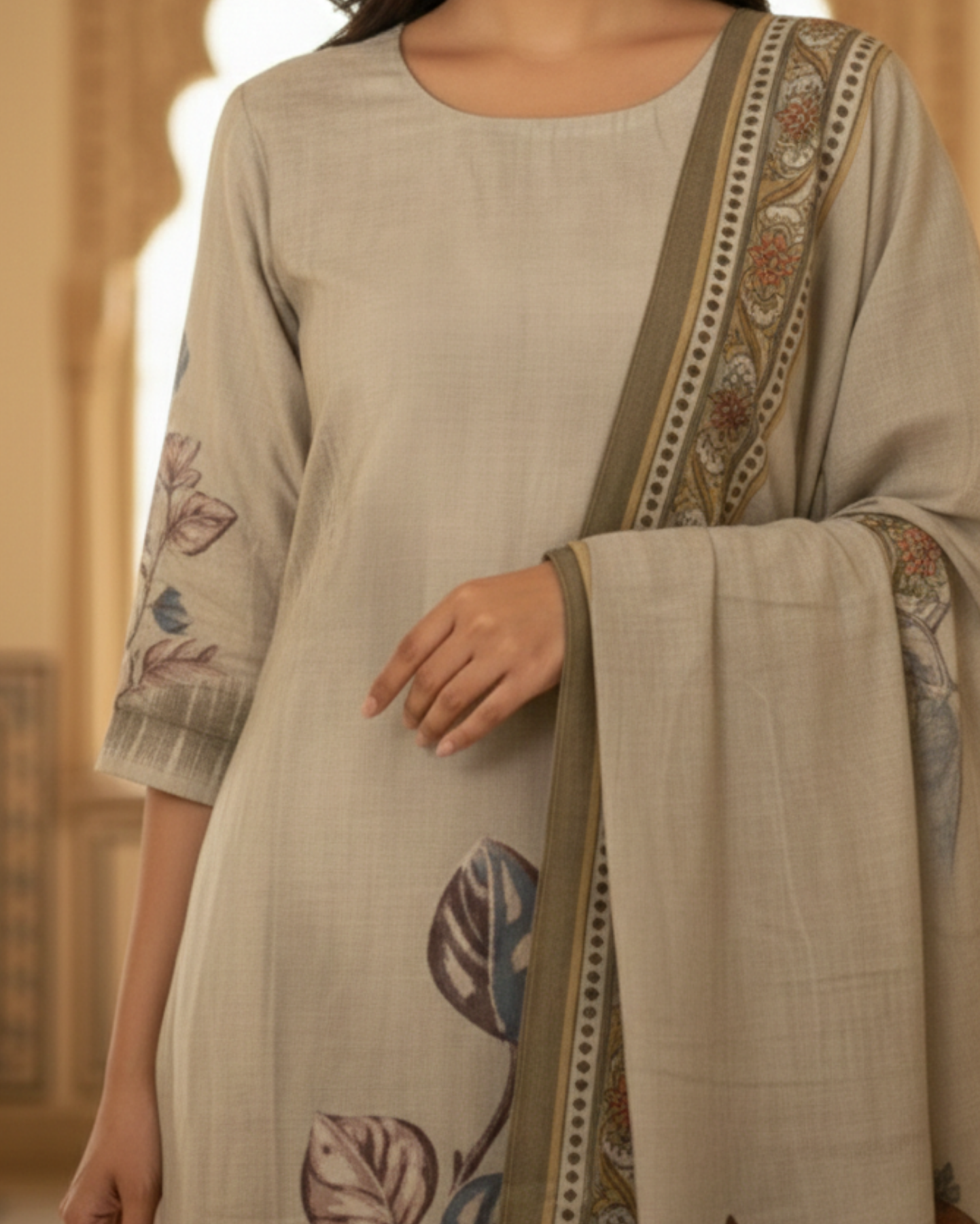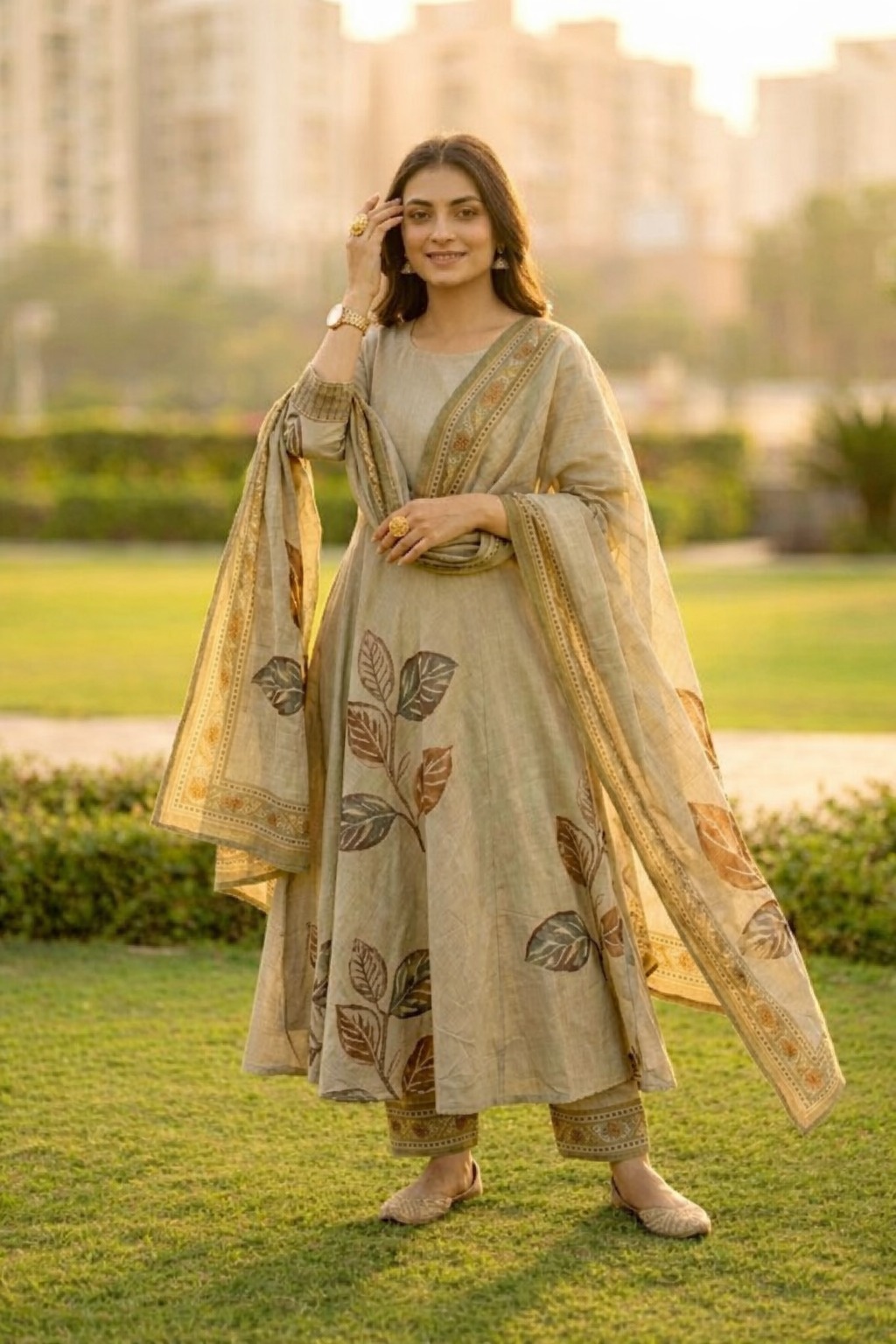Leaf Motifs Sage Rayon kurta set with dupatta
