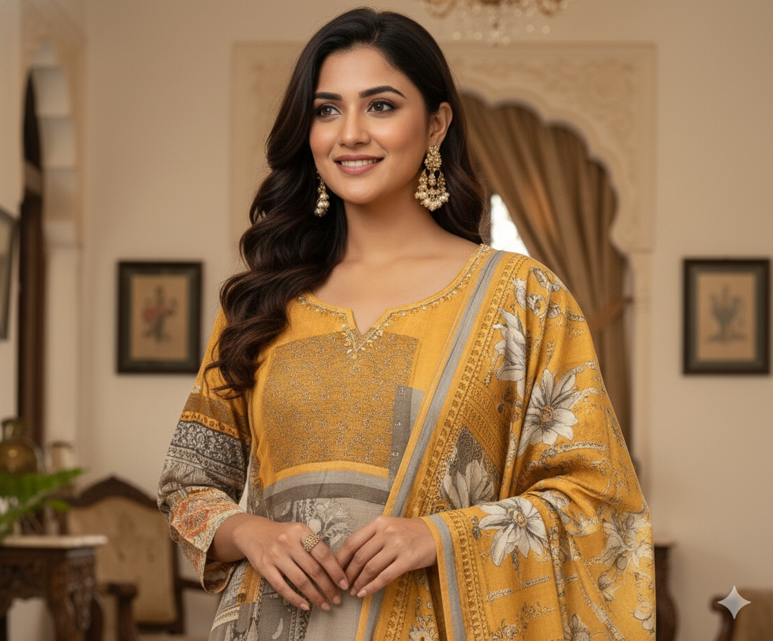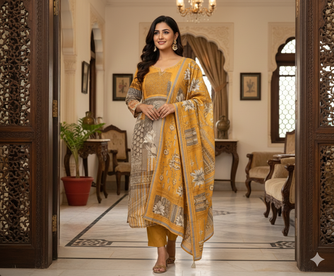 Grey Mustard Printed Sequin Detailed Cotton Linen Kurta Set With Dupatta