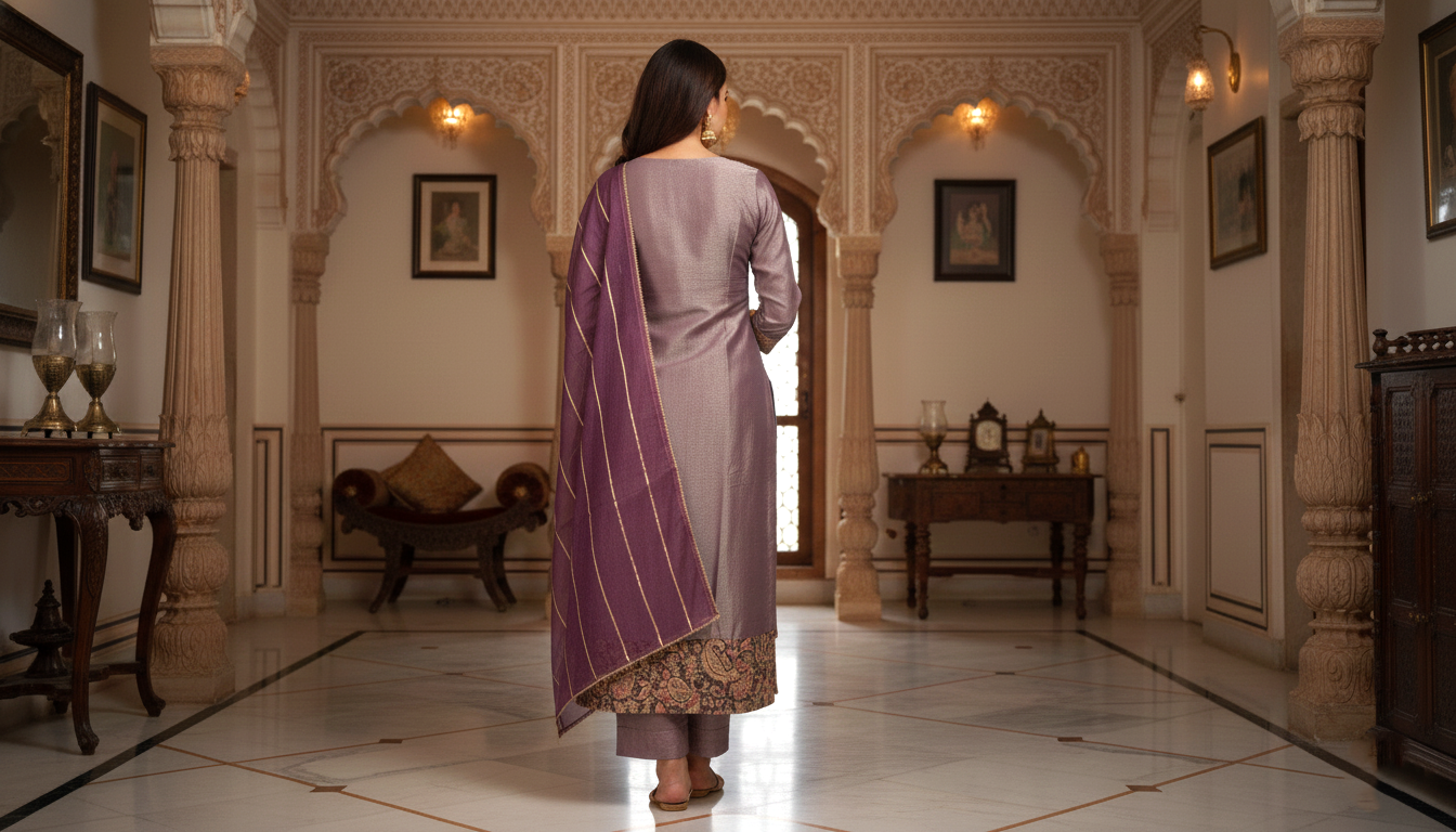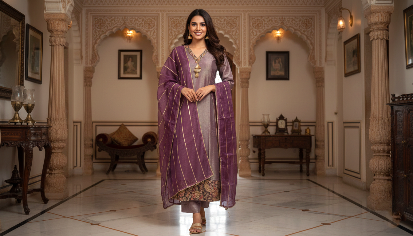 heritage glam ensembleLavender Shimmer Textured With Tassel Neckline Chinon Kurta Set With Mesh dupatta