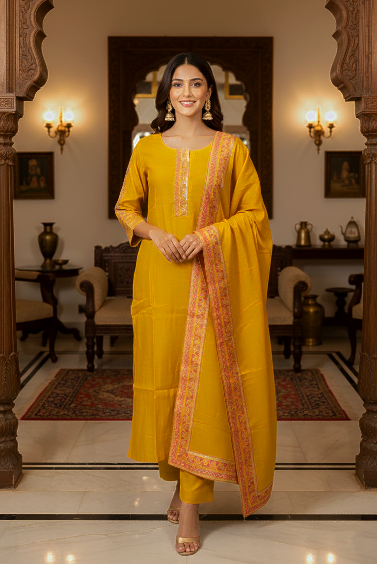 Mustard Cotton Mix Embroidered kurta set with dupatta