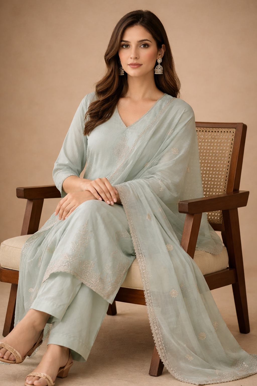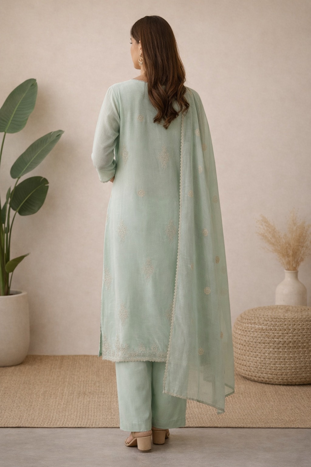 Aqua Green Cotton Mix Kurta Set With Dupatta