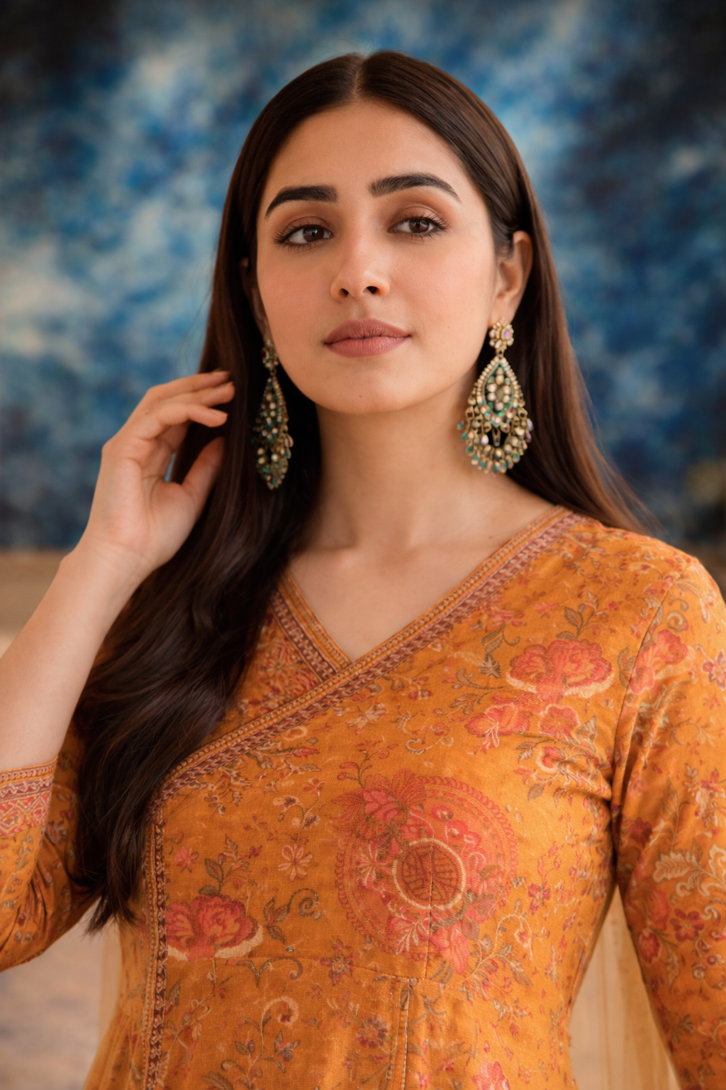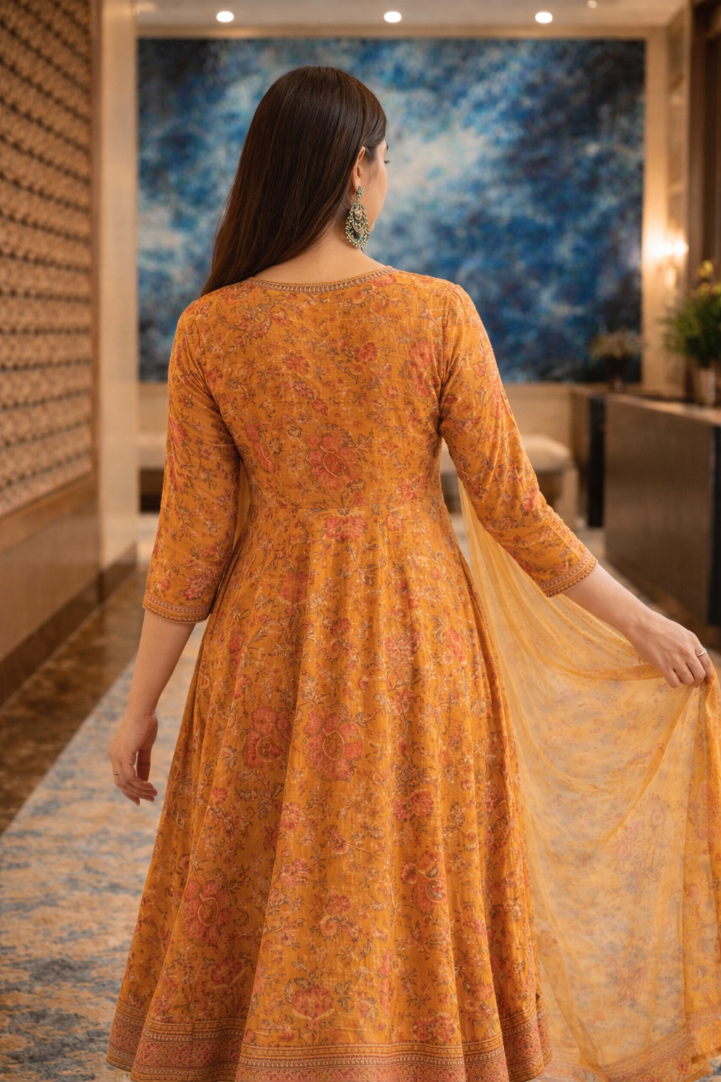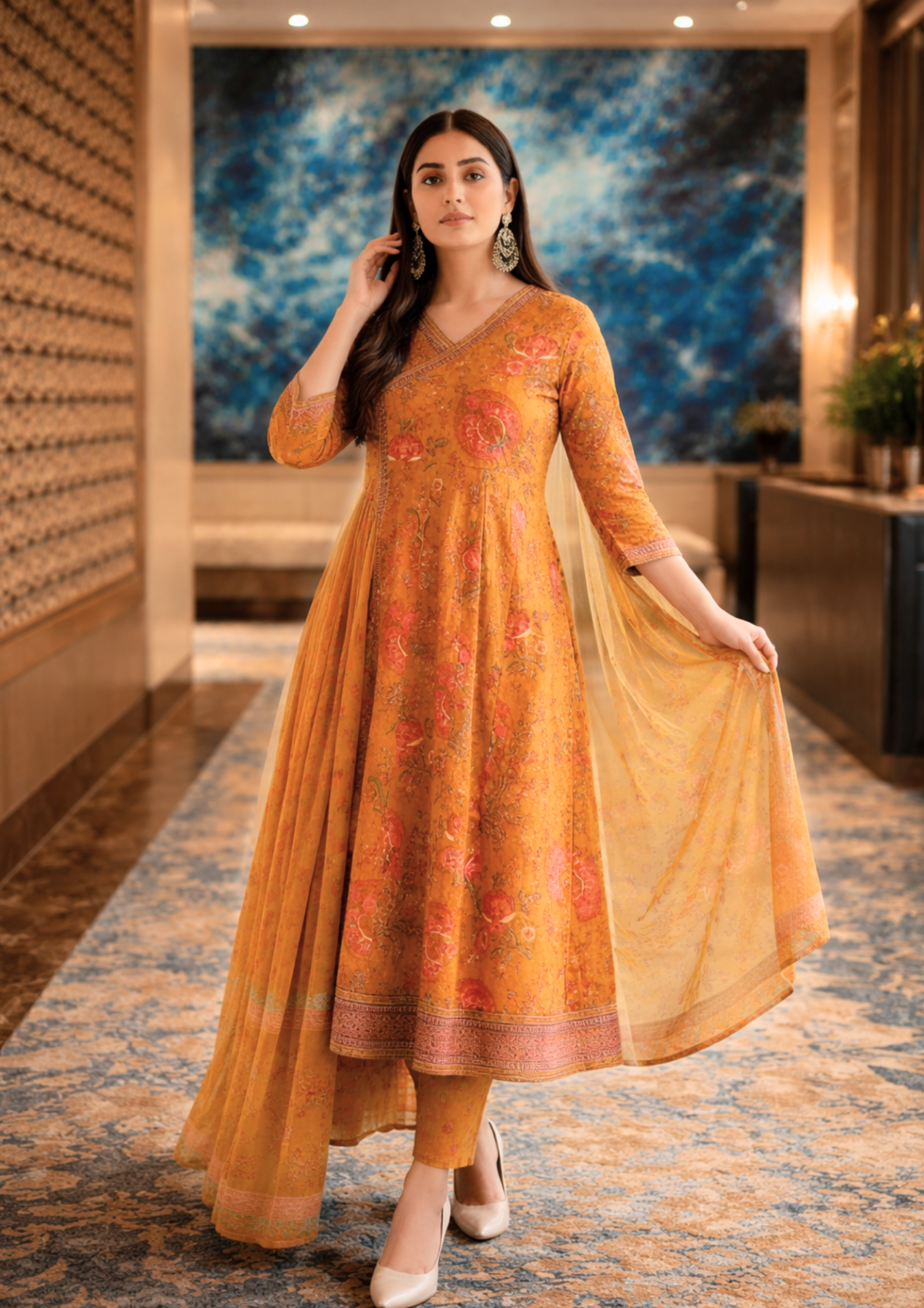 Mustard Floral Printed Cotton Kurta Pant With Matching Dupatta