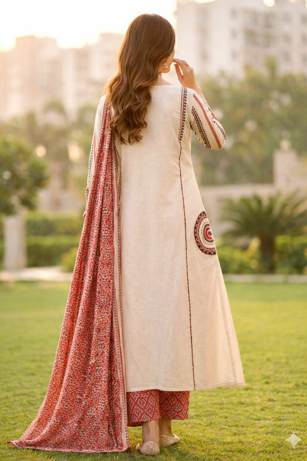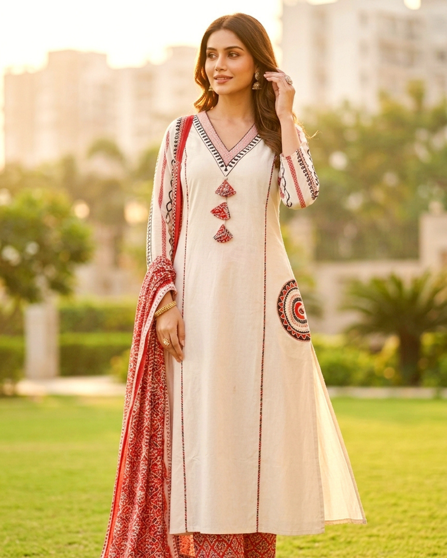Ivory White Cotton Kurta Set Featuring Applique Pocket With Kalamkari Dupatta