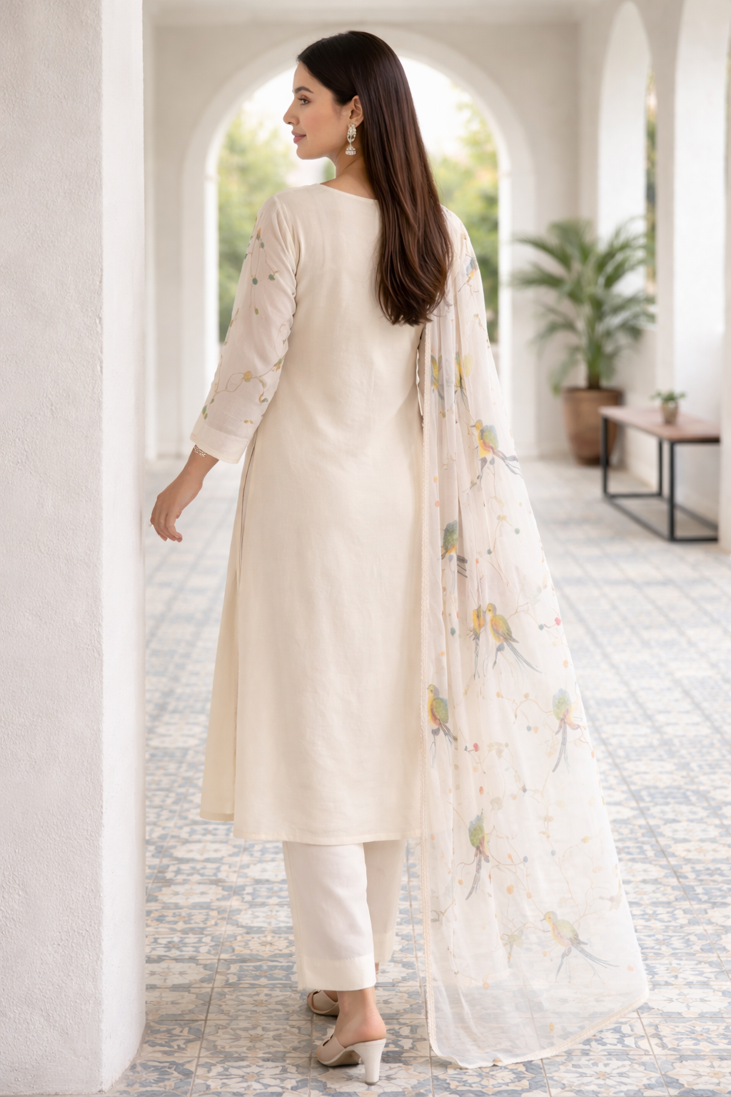 Ivory rayon bird print kurta pant with dupatta