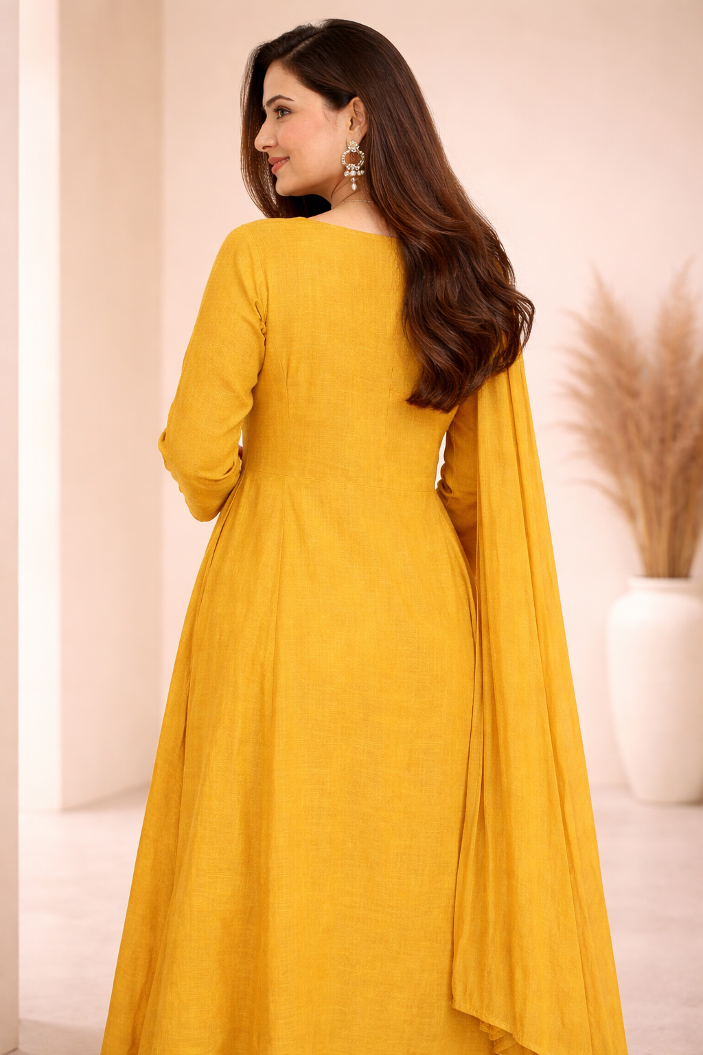 Mustard Cotton Anarkali Kurta Pant With Floral Embroidery And Dupatta