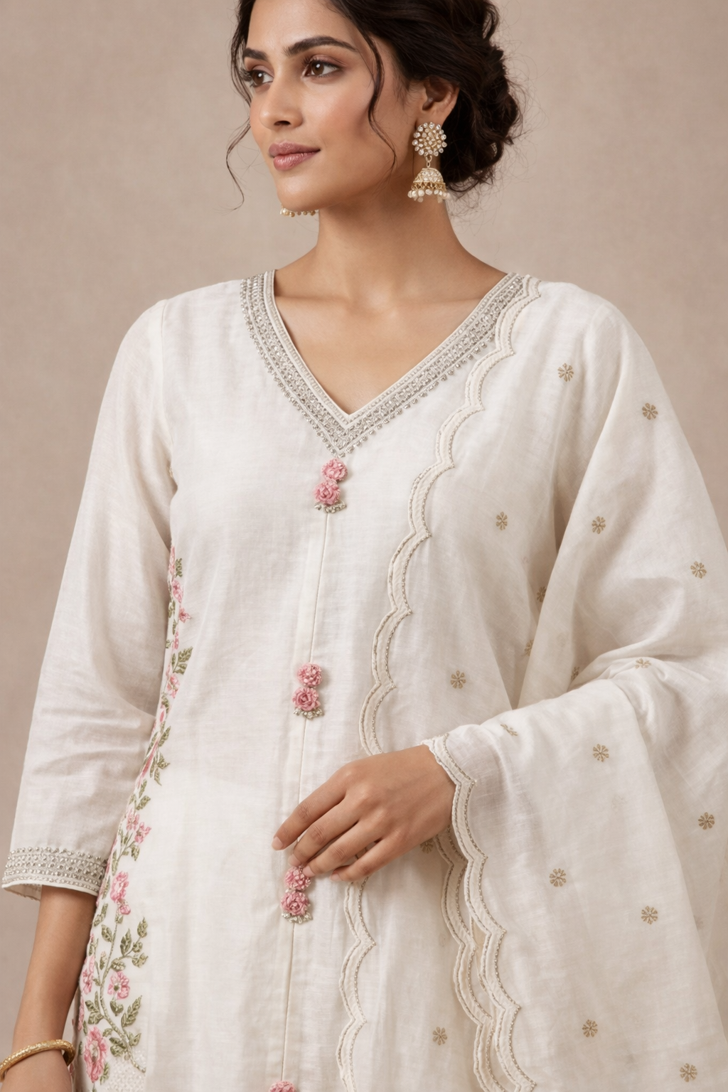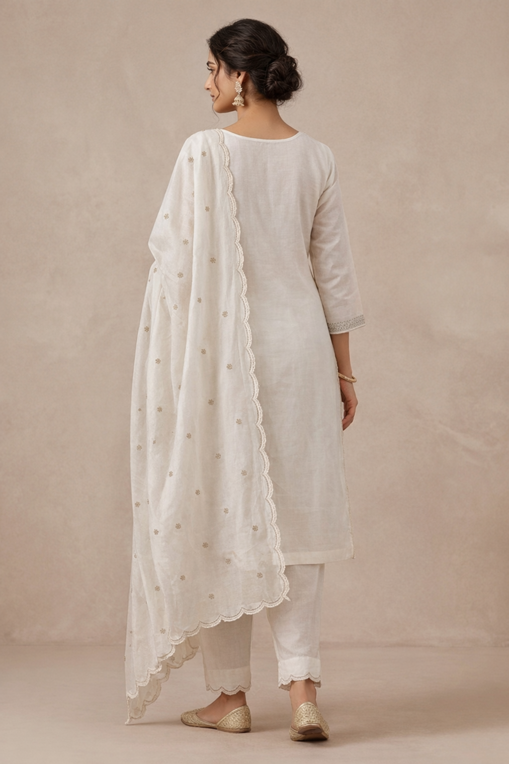 Ivory malmal blend kurta pant set with embroidered chiffon dupatta