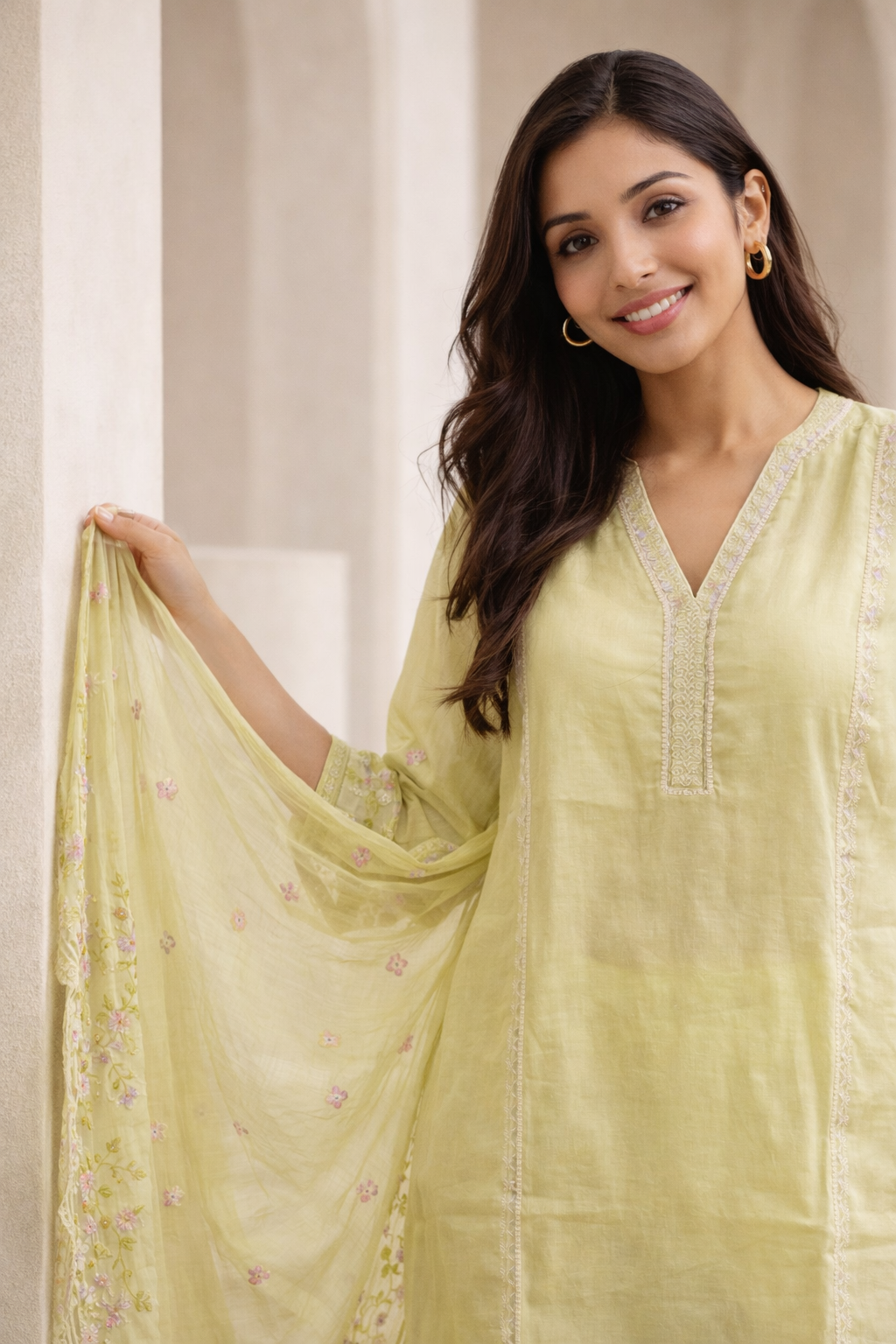 Pastel green silk embroidered kurta pant set with dupatta