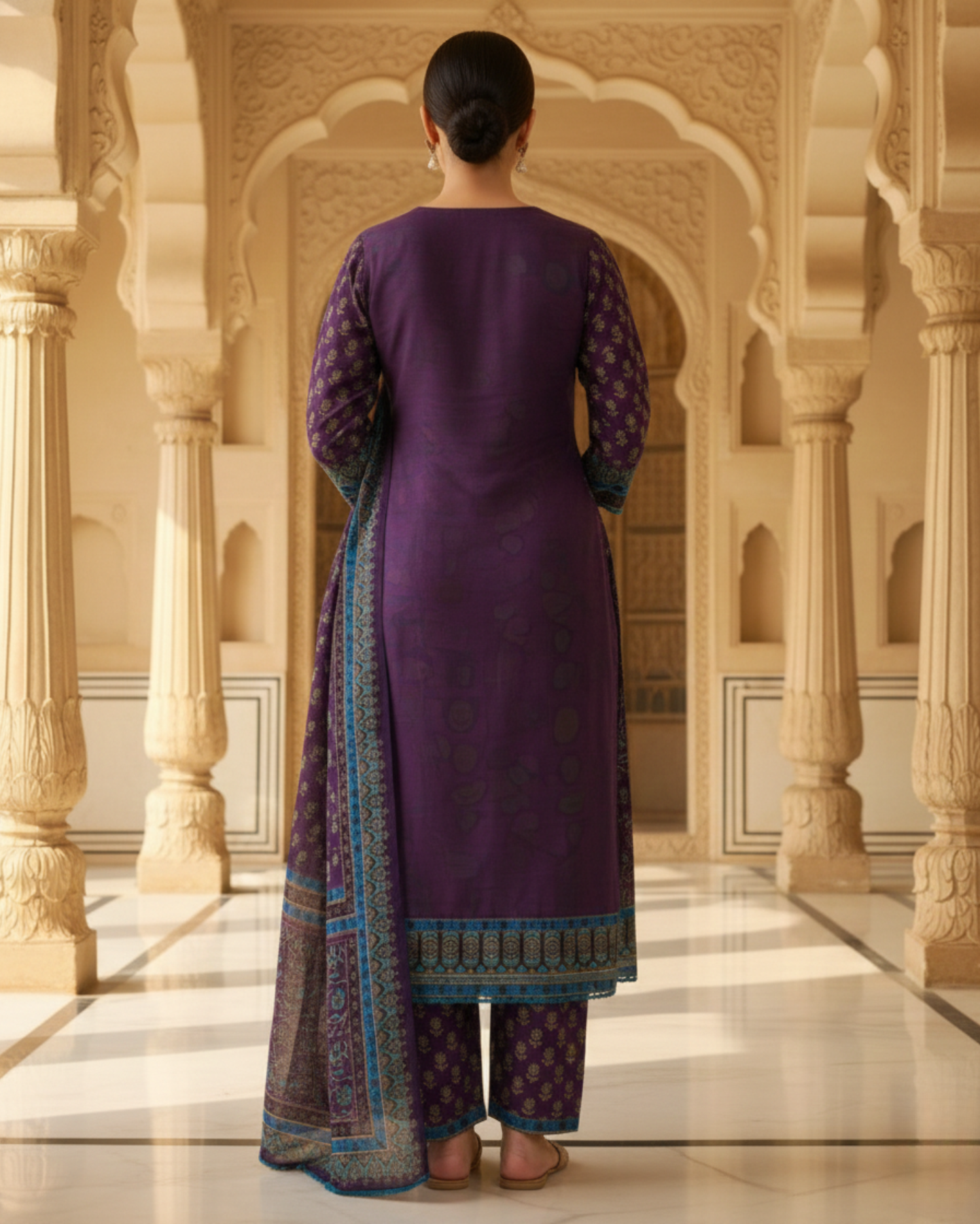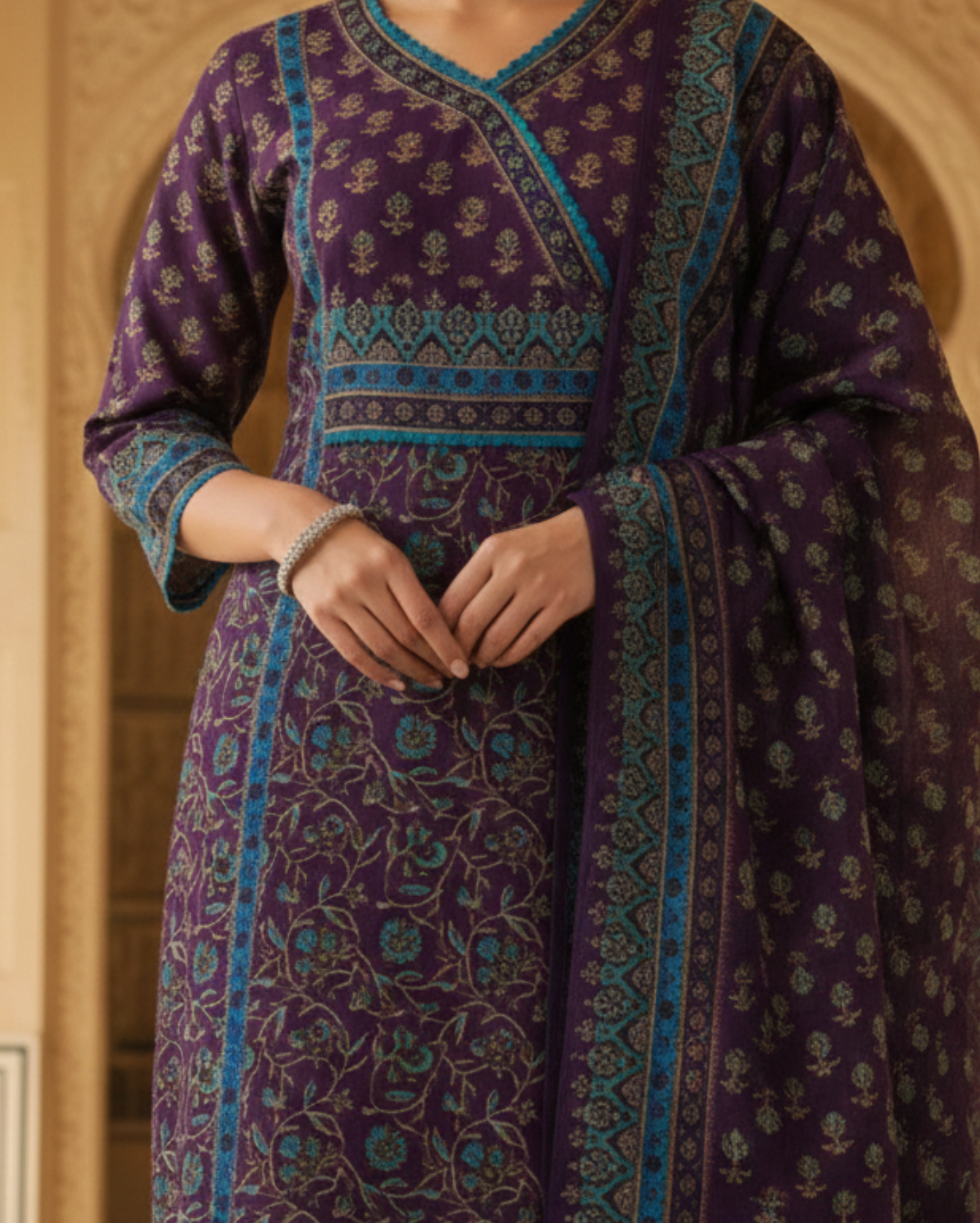 plum floral sangneri printed cotton kurta set with teal borders paired with a lightweight dupattaPlum Floral Sangneri Printed Cotton Kurta Set With Teal Borders Paired With a Lightweight Dupatta