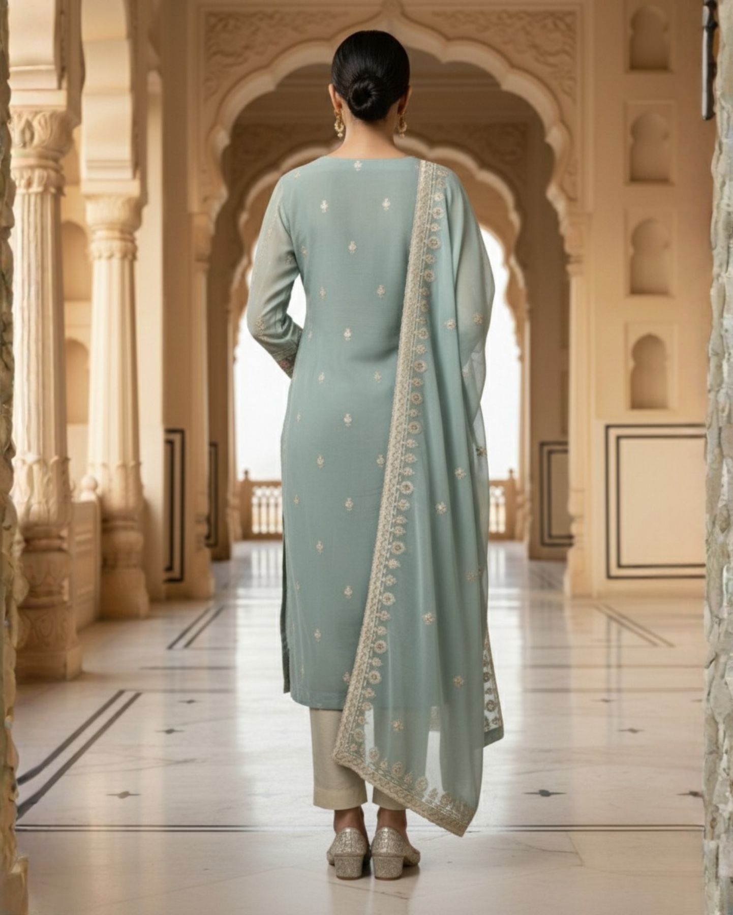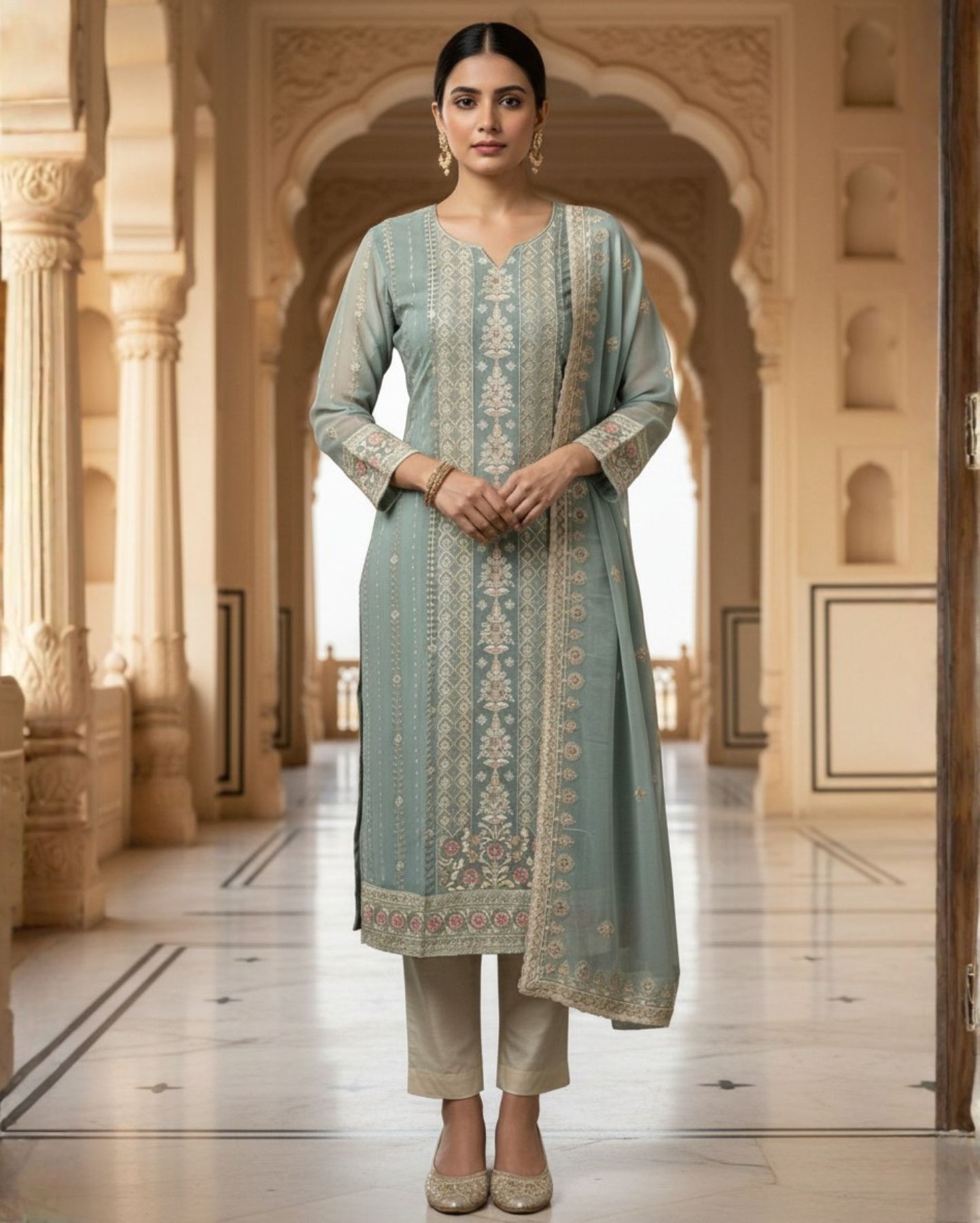 Unstitched Aqua Blue Organza Enhanced With Delicate Ivory Embroidery And Sequin Highlights Suit Material
